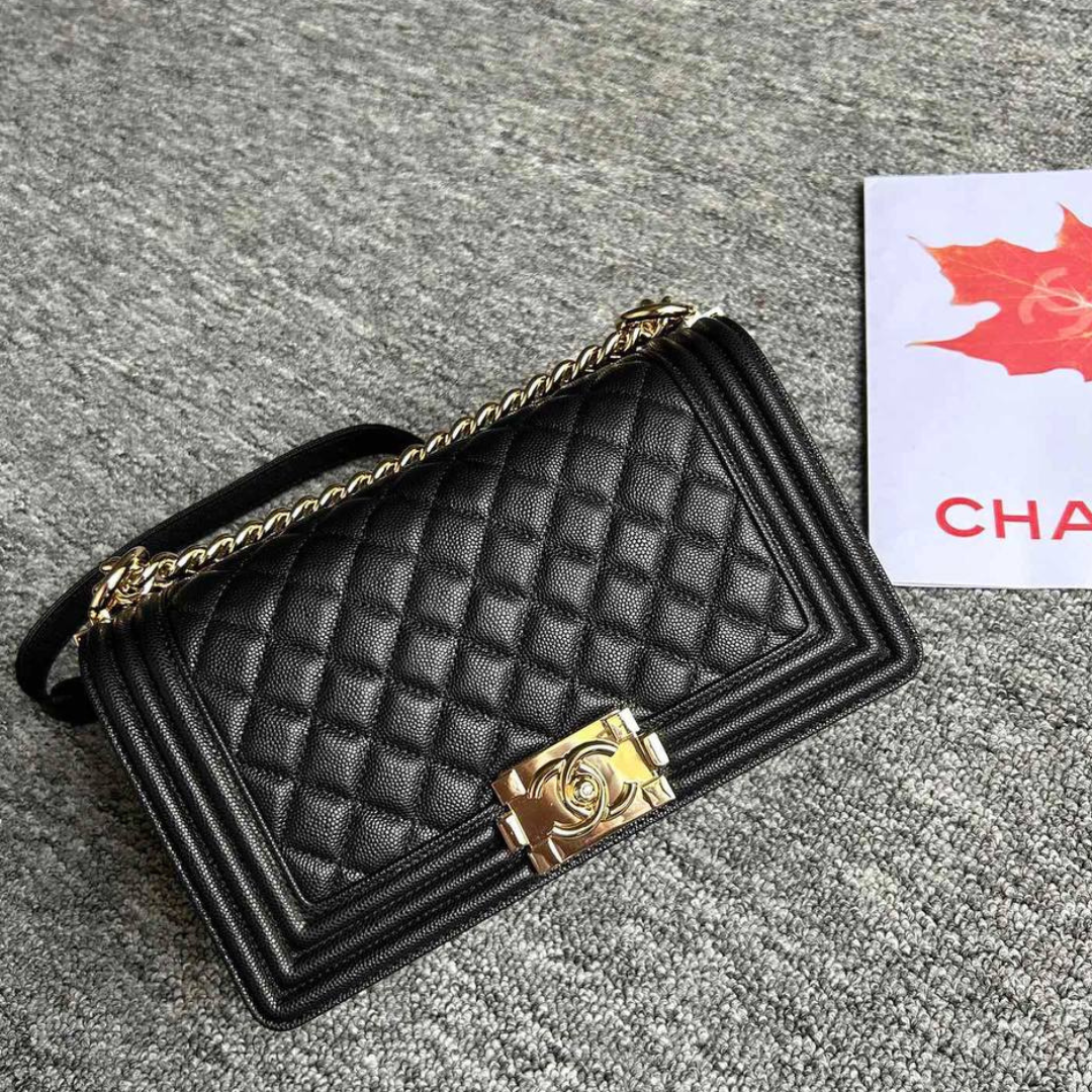 Mini Borsa Chanel Boy in pelle nera con finiture dorate 25 cm