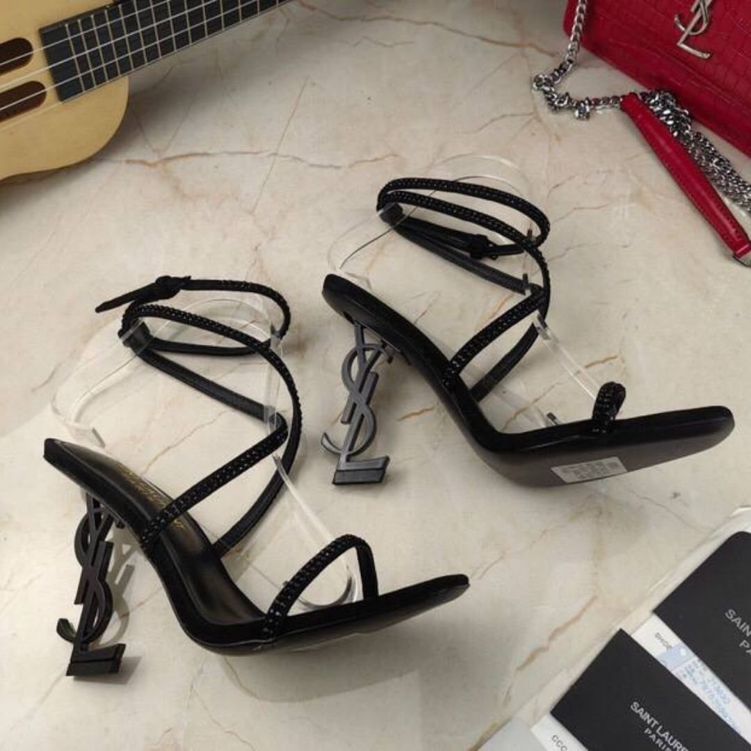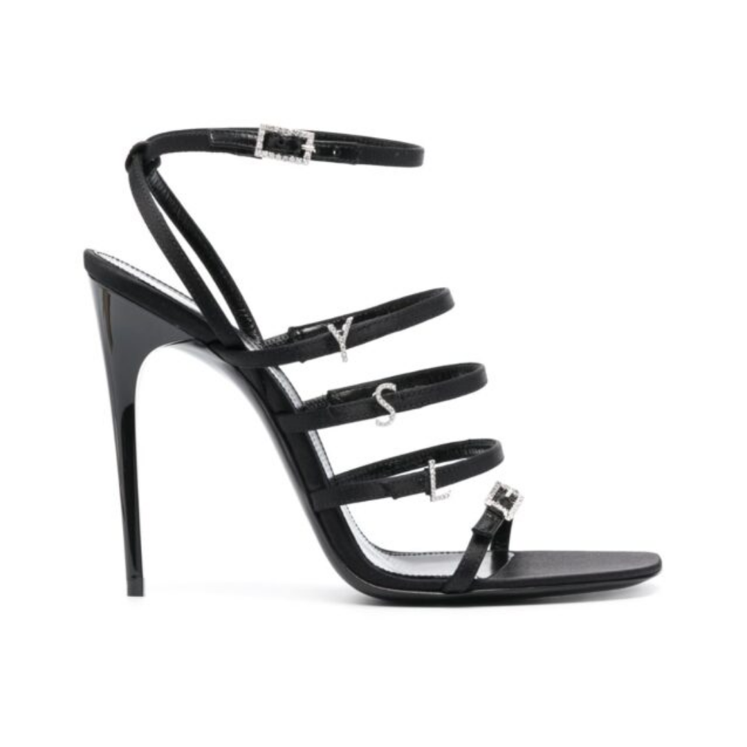 Dettagli:● Materiale: Pelle e strass● Colore: Nero● Chiusura: Cinturino alla caviglia con chiusura a gancio● Logo: Tacco scultura YSL nero●