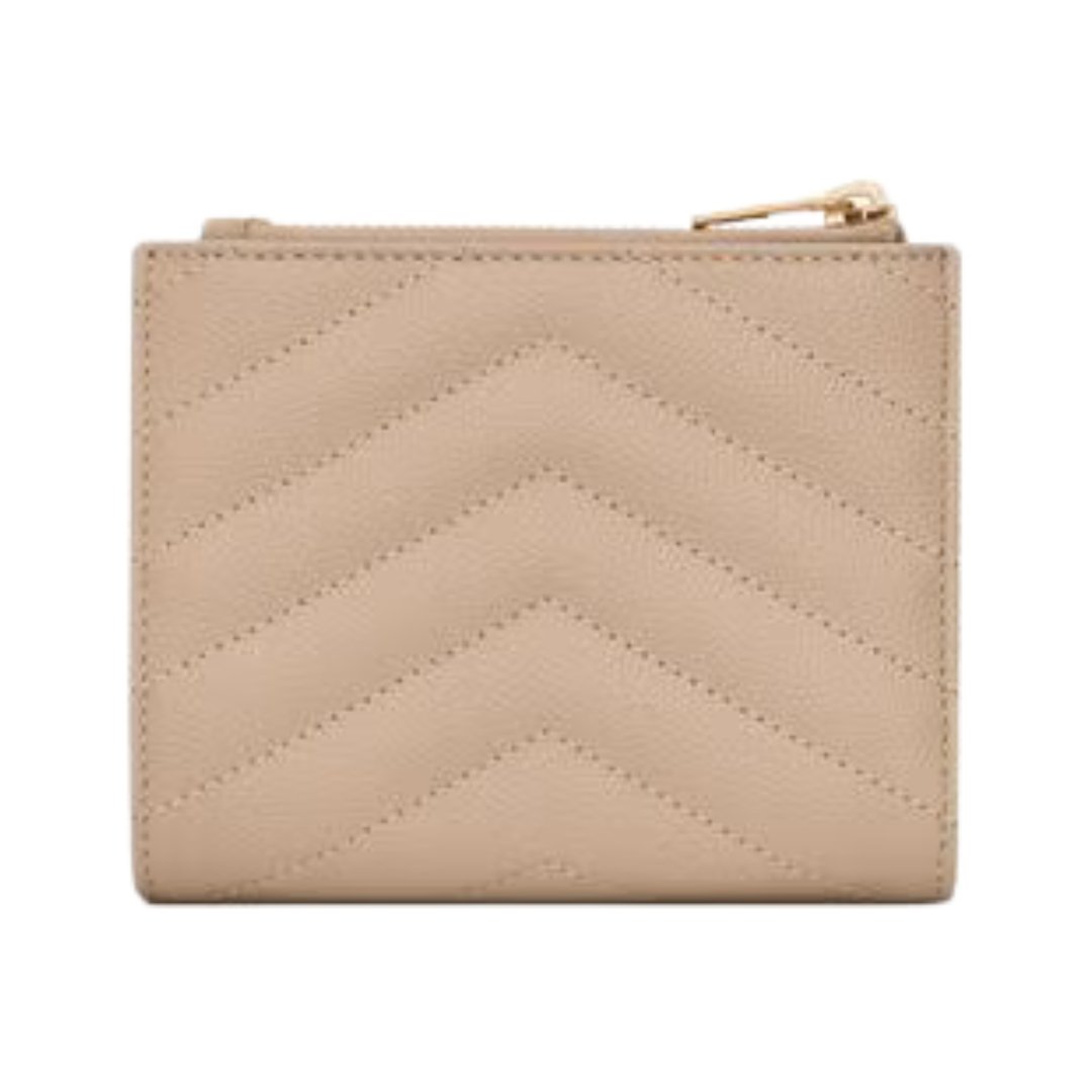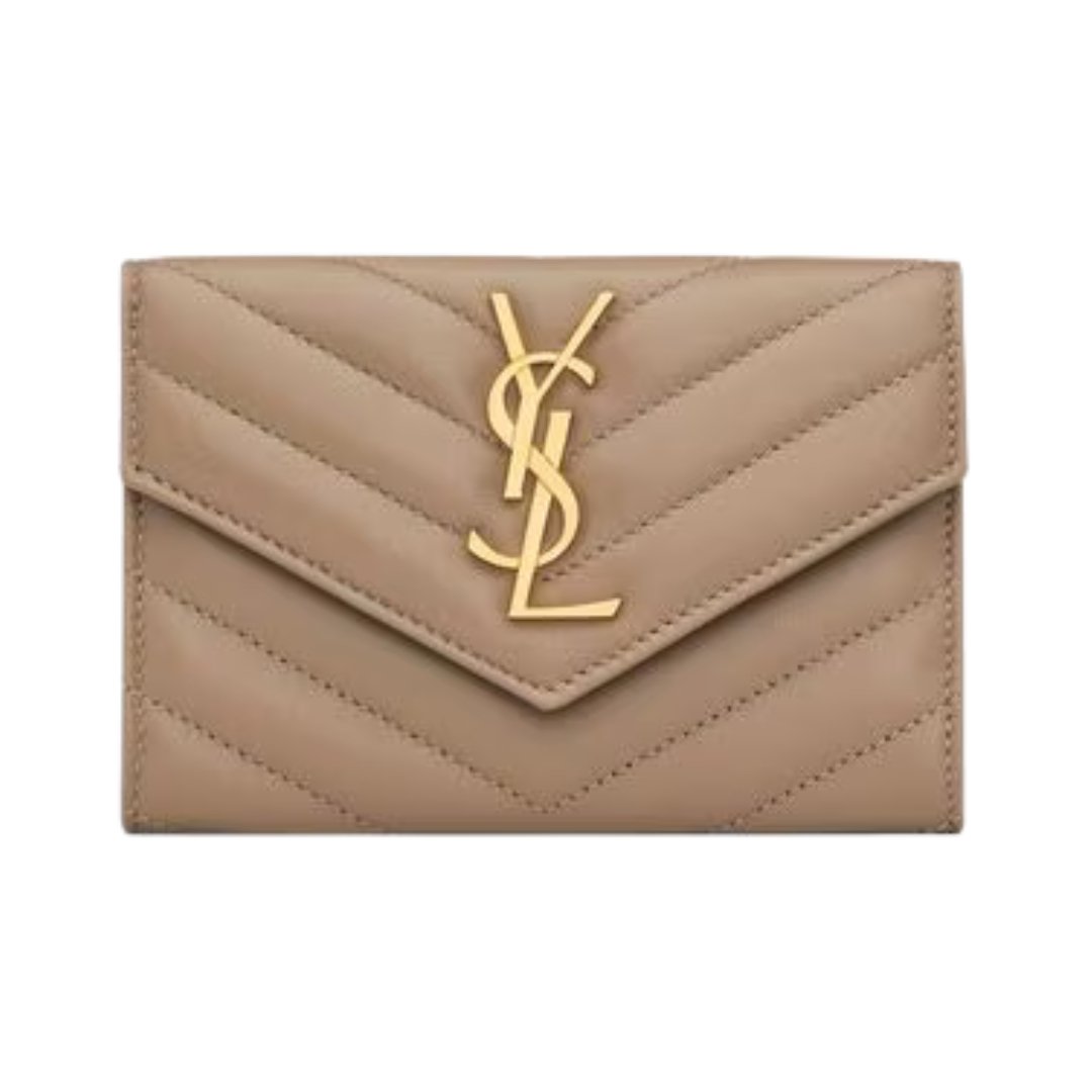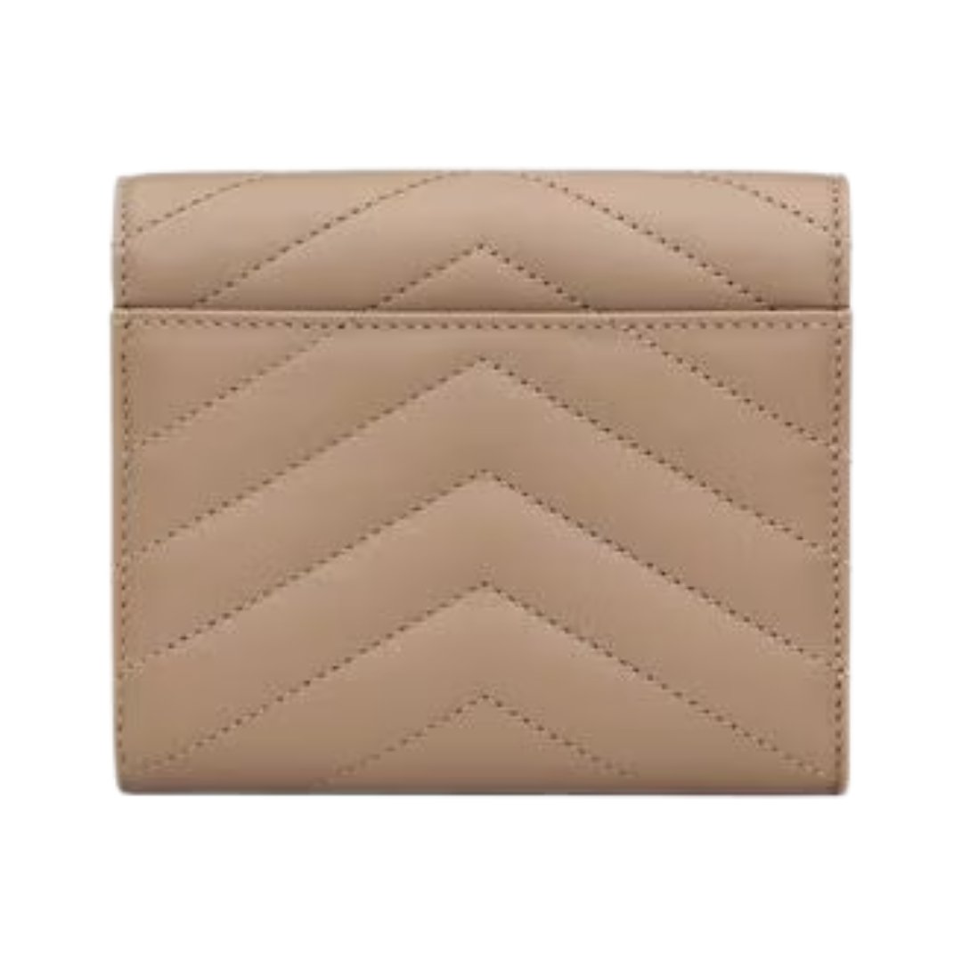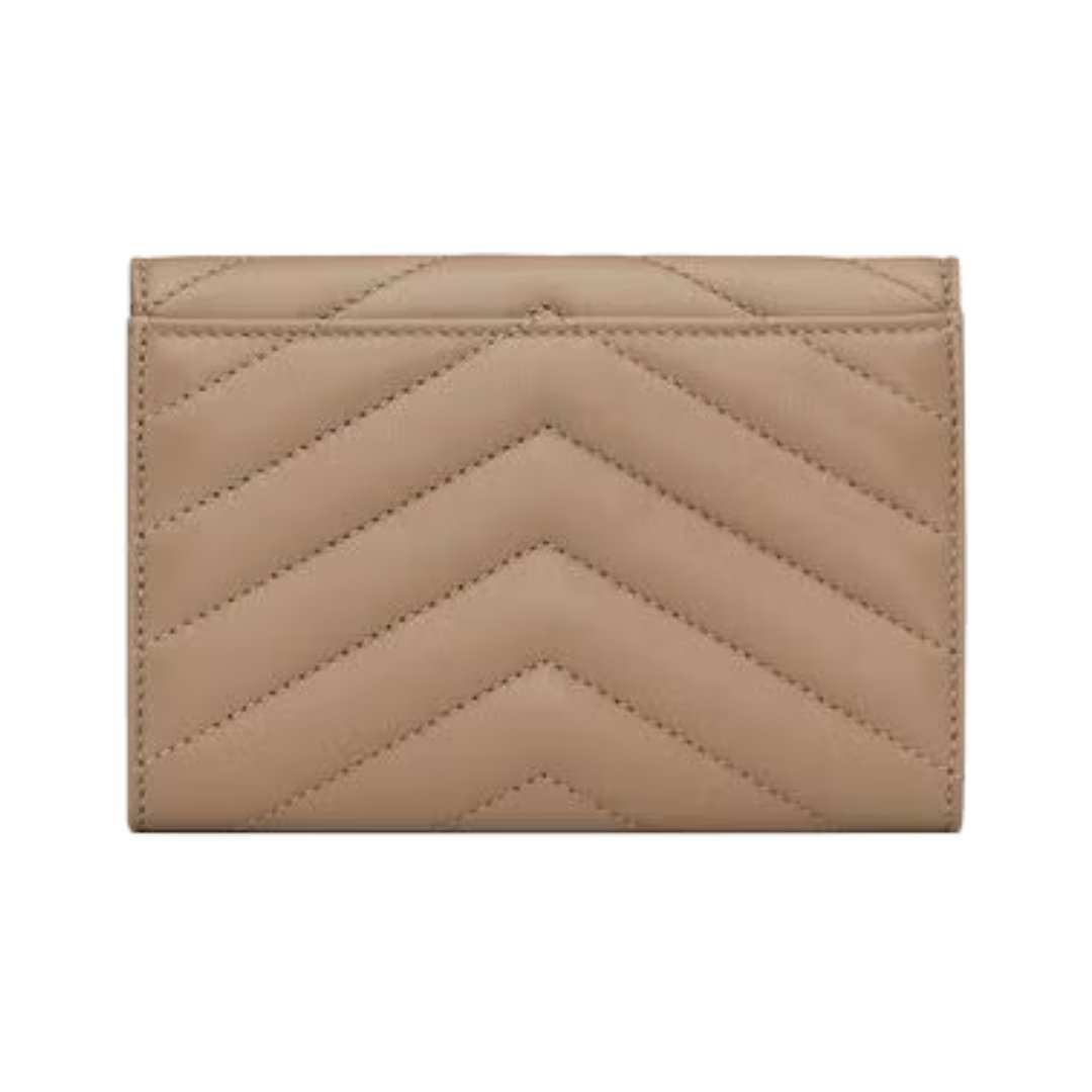 Dettagli:● Materiale: Pelle grain de poudre● Colore: Beige sabbia● Chiusura: Patta con bottone● Logo: YSL dorato● Interno: Scomparti per carte