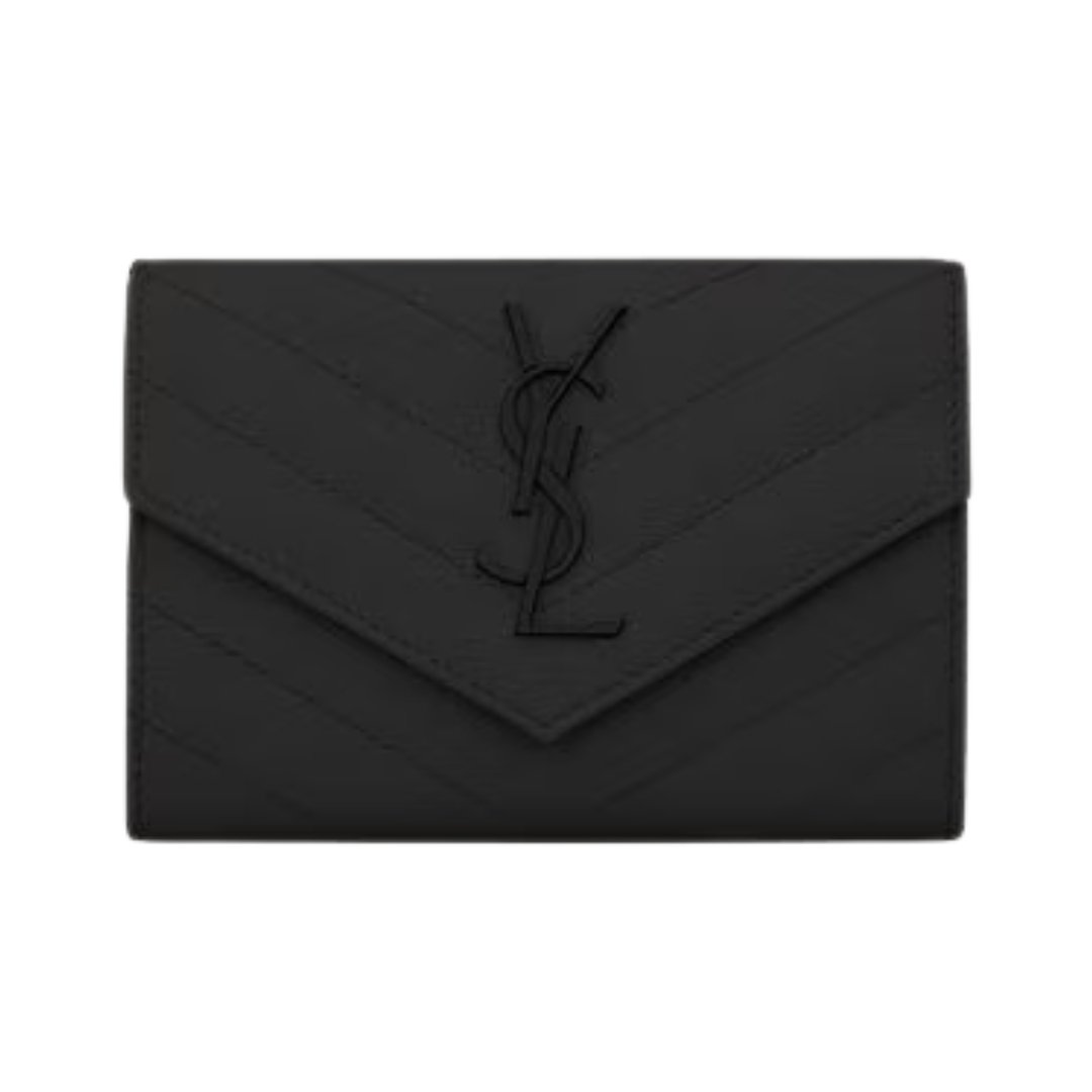 Dettagli:● Materiale: Pelle grain de poudre matelassé● Colore: Nero● Chiusura: Bottone a pressione● Logo: Monogram YSL dorato● Interno: Slot per