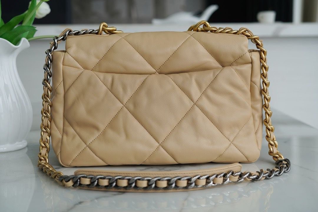 Borsa Chanel 19 in pelle beige con catena dorata 30 cm