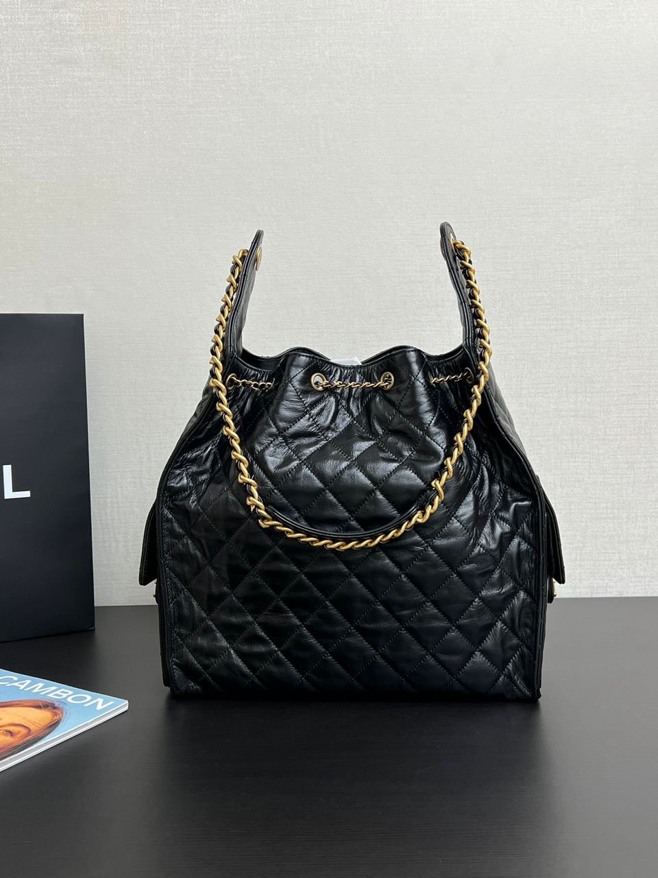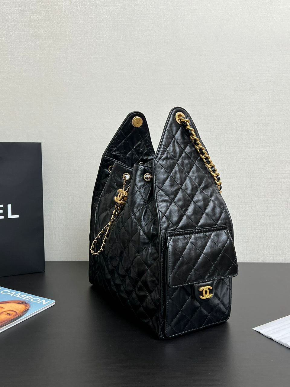 Chiusura: Coulisse superiore con catena e logo CC dorato
