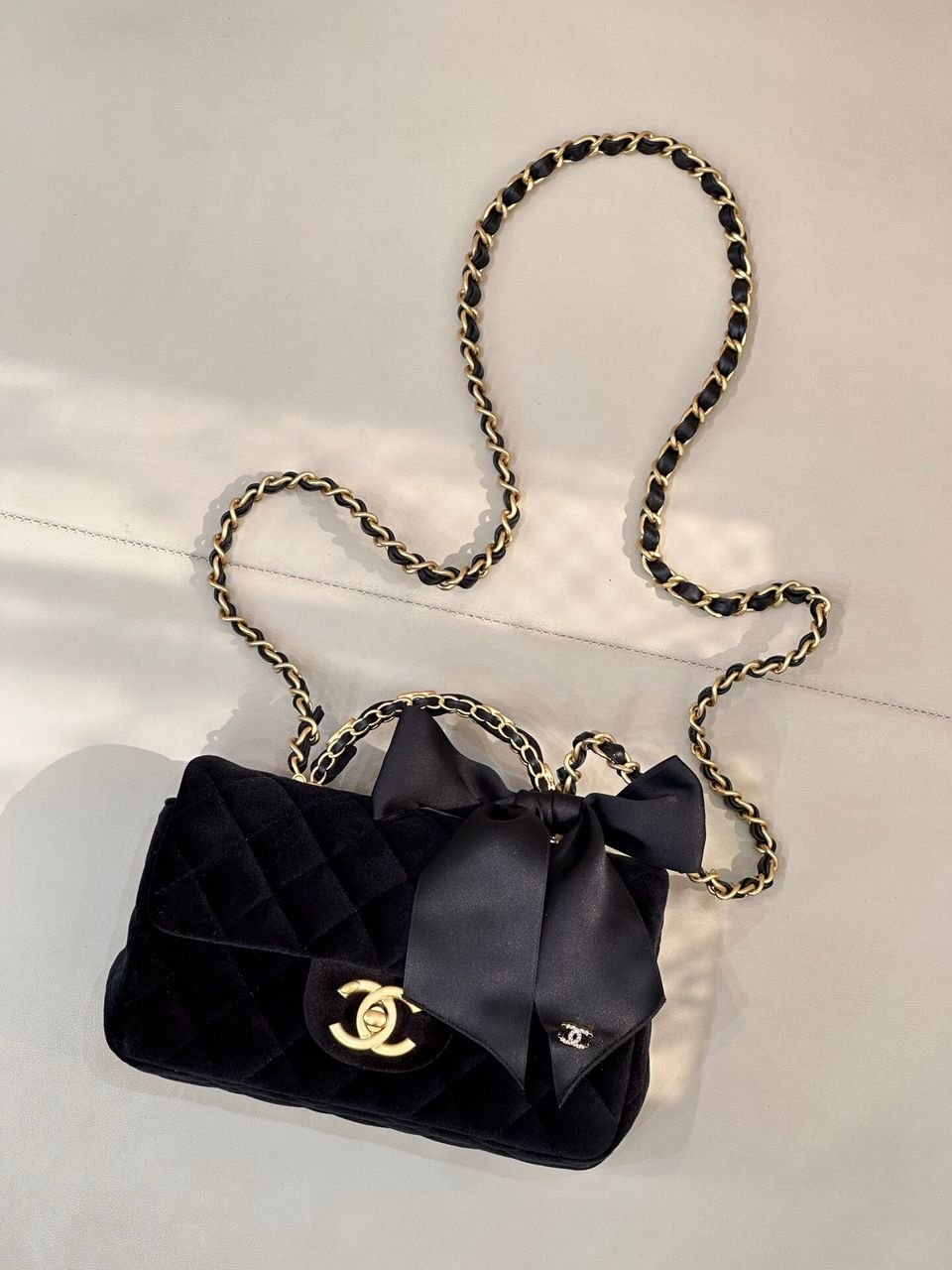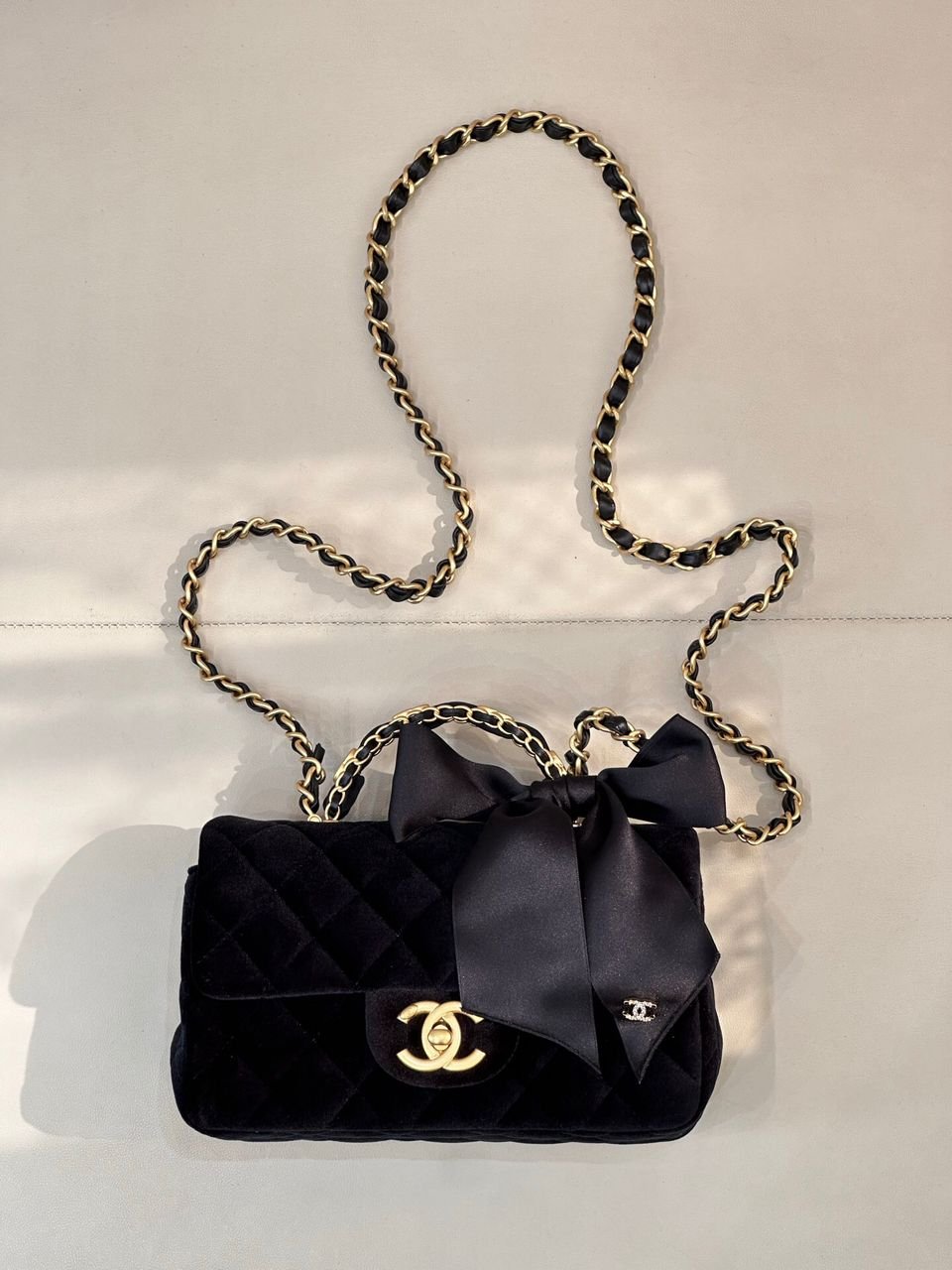 ● Materiale: velluto nero con dettaglio superiore in pelle liscia