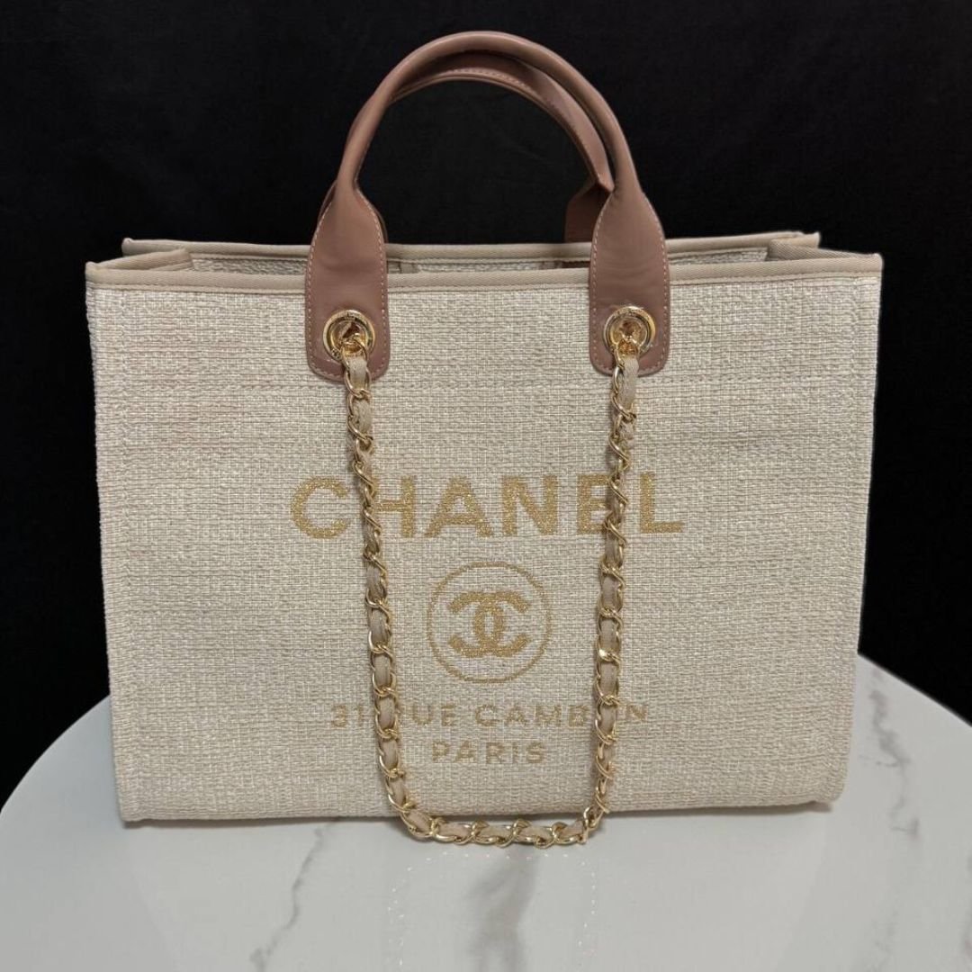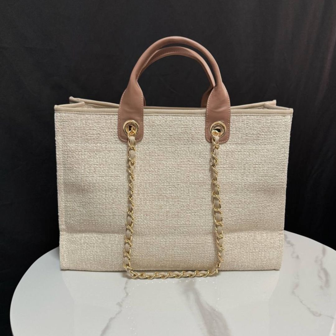 ● Tracolla: Doppia catena dorata intrecciata con pelle beige, più doppi manici superiori in pelle naturale
