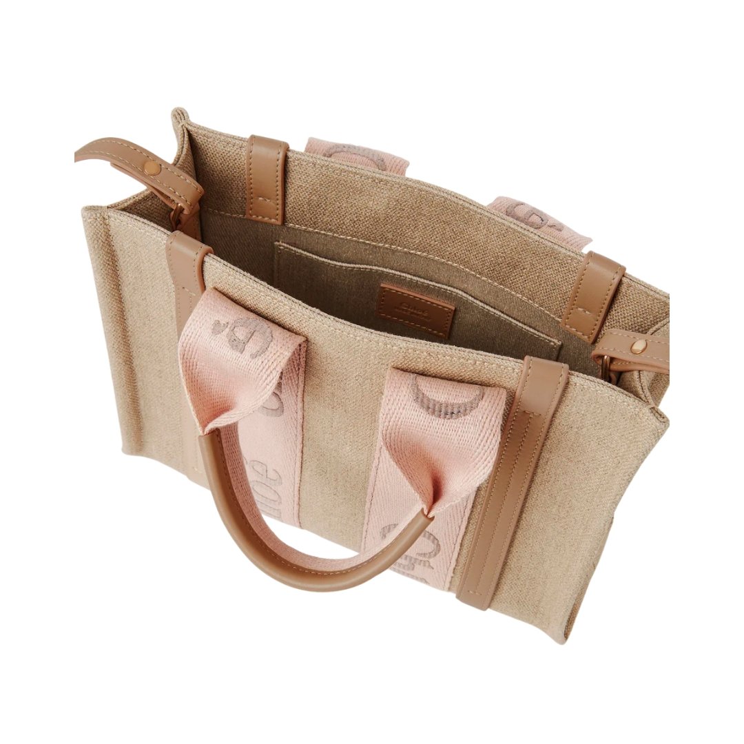 Borsa shopper piccola Chloé Woody in tela beige e pelle 26 cm