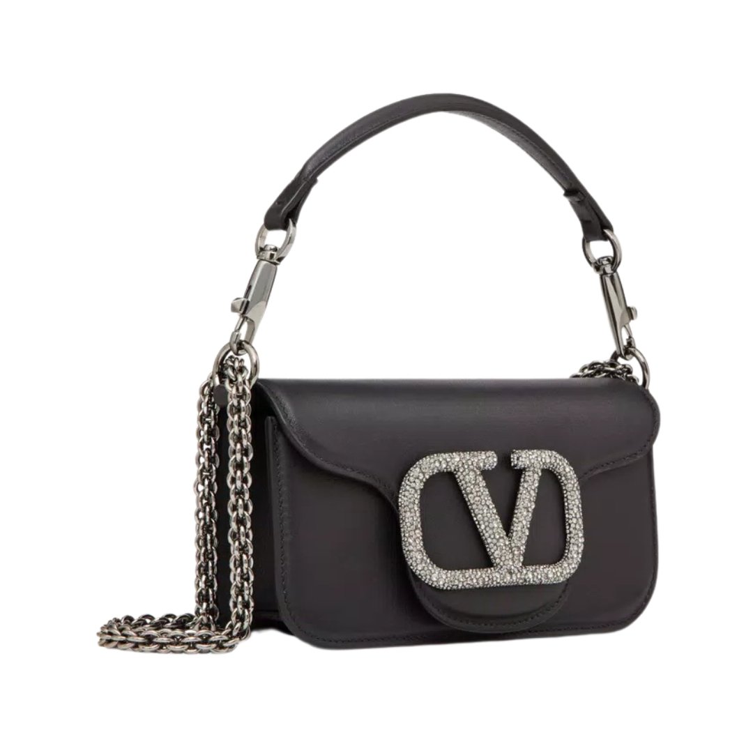 Borsa Valentino Locò piccola in pelle nera con logo gioiello 20 cm