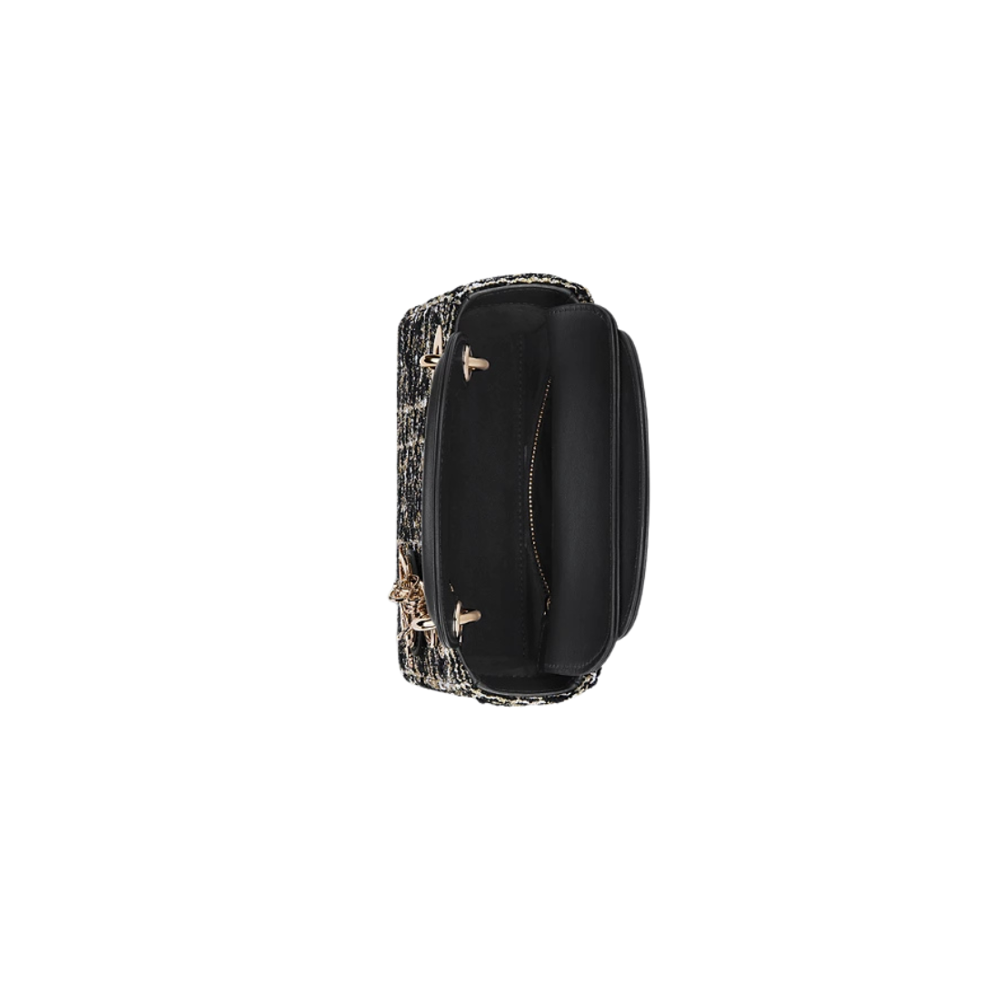 ● Materiale: Tessuto tweed con fili metallici oro intrecciati e motivo a quadri tono su tono