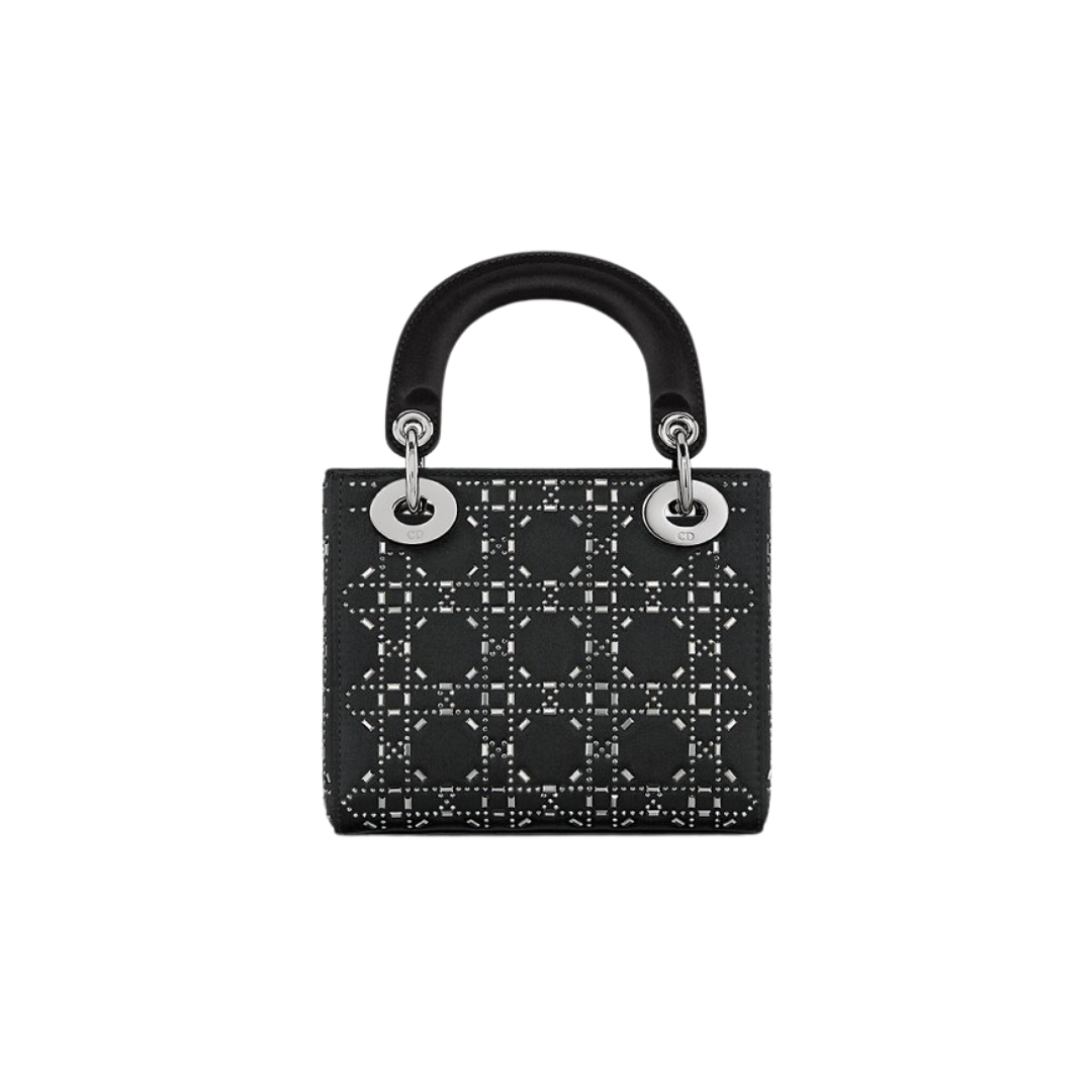 ● Materiale: satin nero ricamato a mano con cristalli Strass che disegnano il motivo Cannage