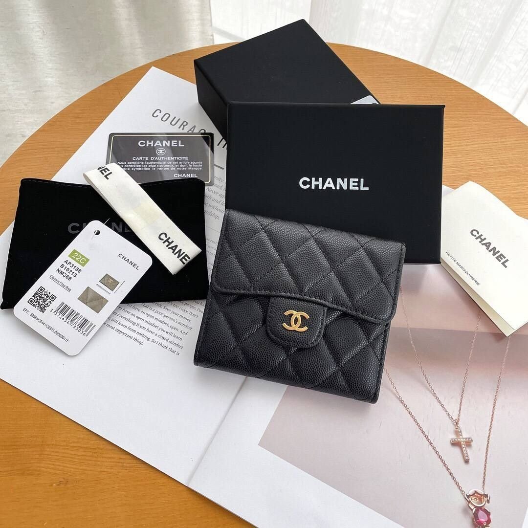Portafoglio Chanel Classic in pelle nera con finiture dorate 10,5 cm