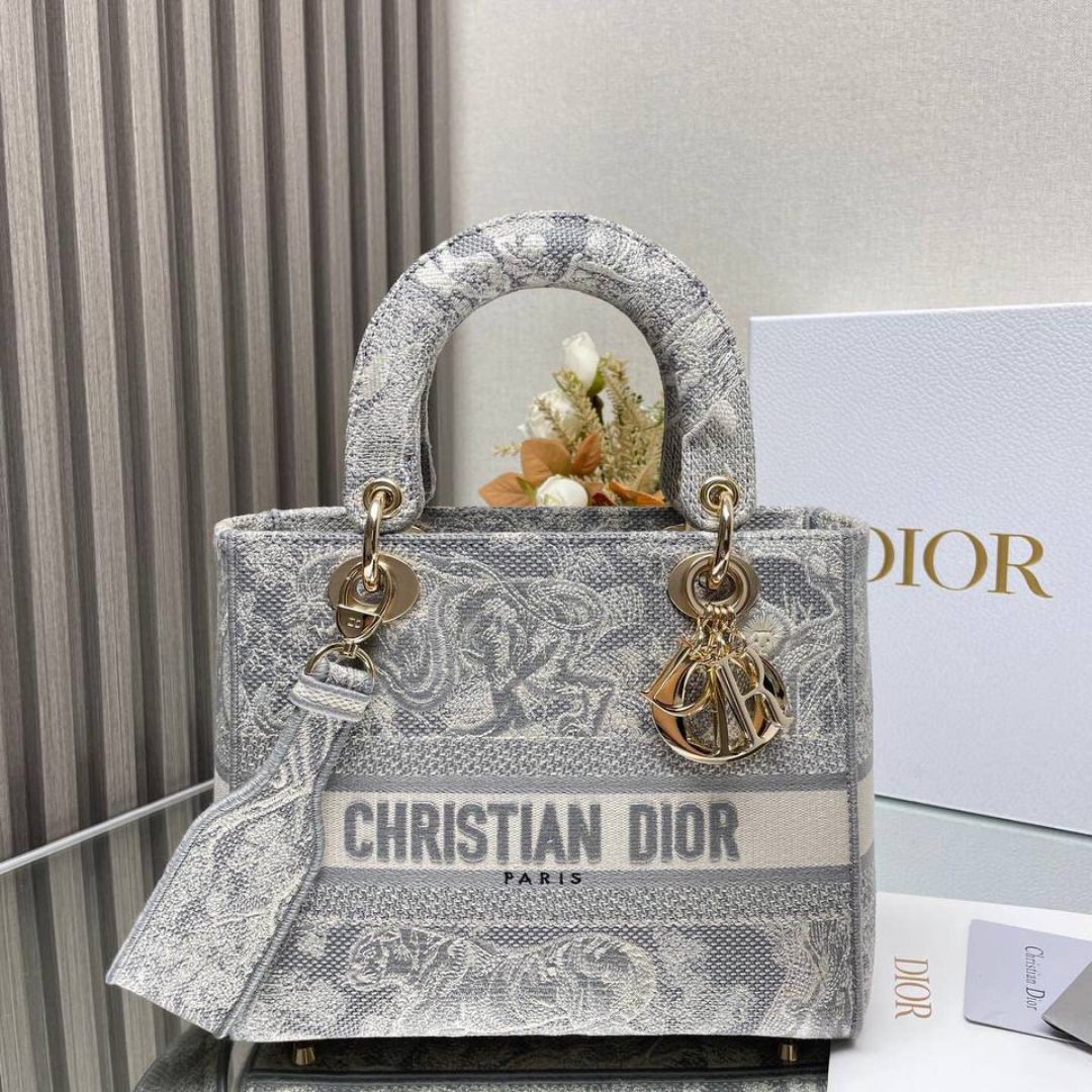 Borsa Dior Lady D-Lite in ricamo bianco/grigio 24 cm