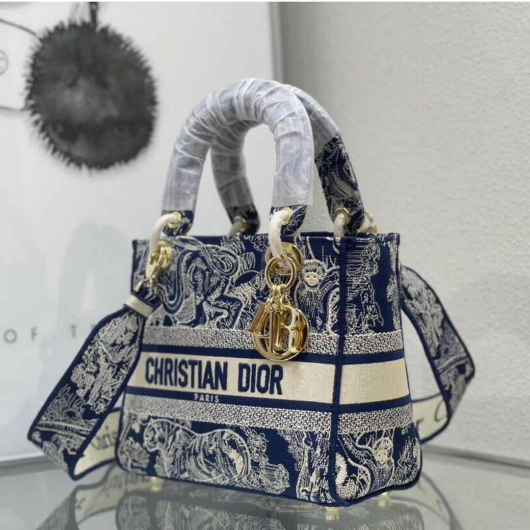 Borsa Dior Lady D-Lite in ricamo blu 24 cm