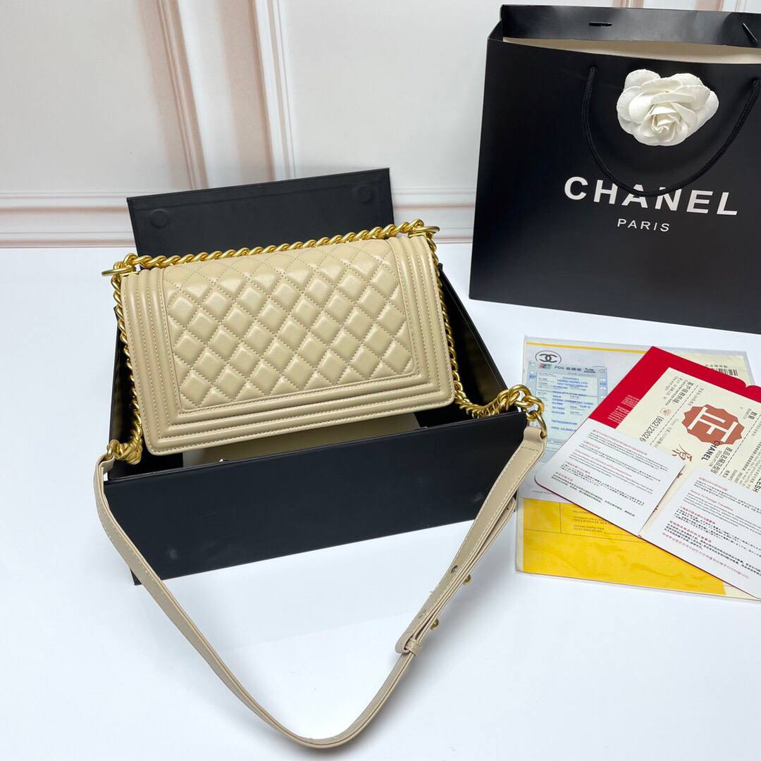 Borsa Chanel Boy in pelle beige con catena dorata 25 cm