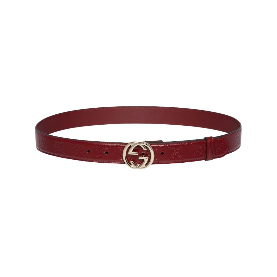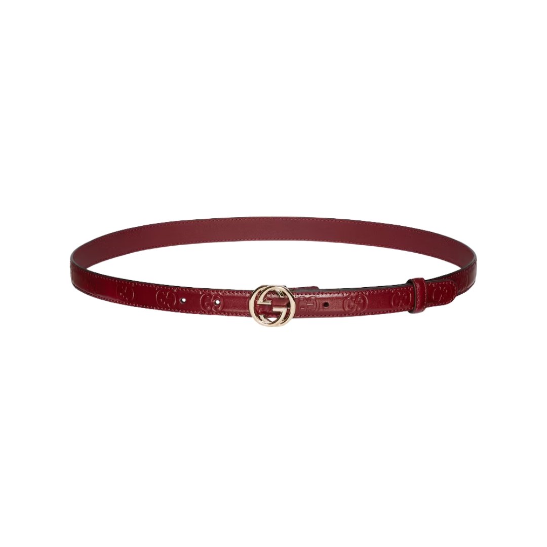 Dettagli:● Materiale: Pelle● Colore: Rosso ciliegia● Chiusura: Fibbia GG● Logo: GG dorato intrecciato● Altezza cintura: 2 cm● Parti metalliche: Dorate