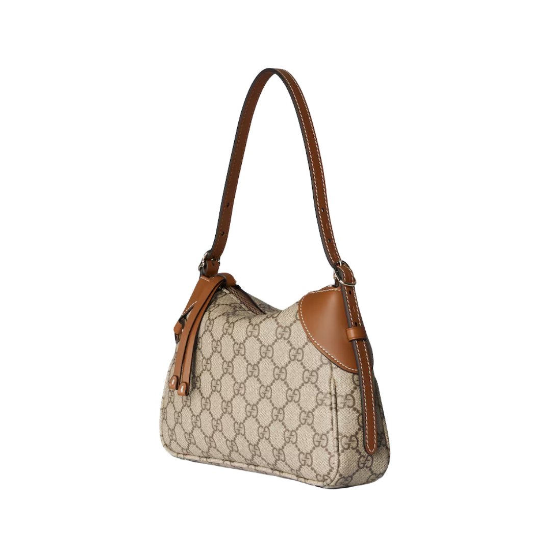 Borsa Gucci GG Emblem piccola in tessuto GG beige e pelle marrone scuro 24.5 cm