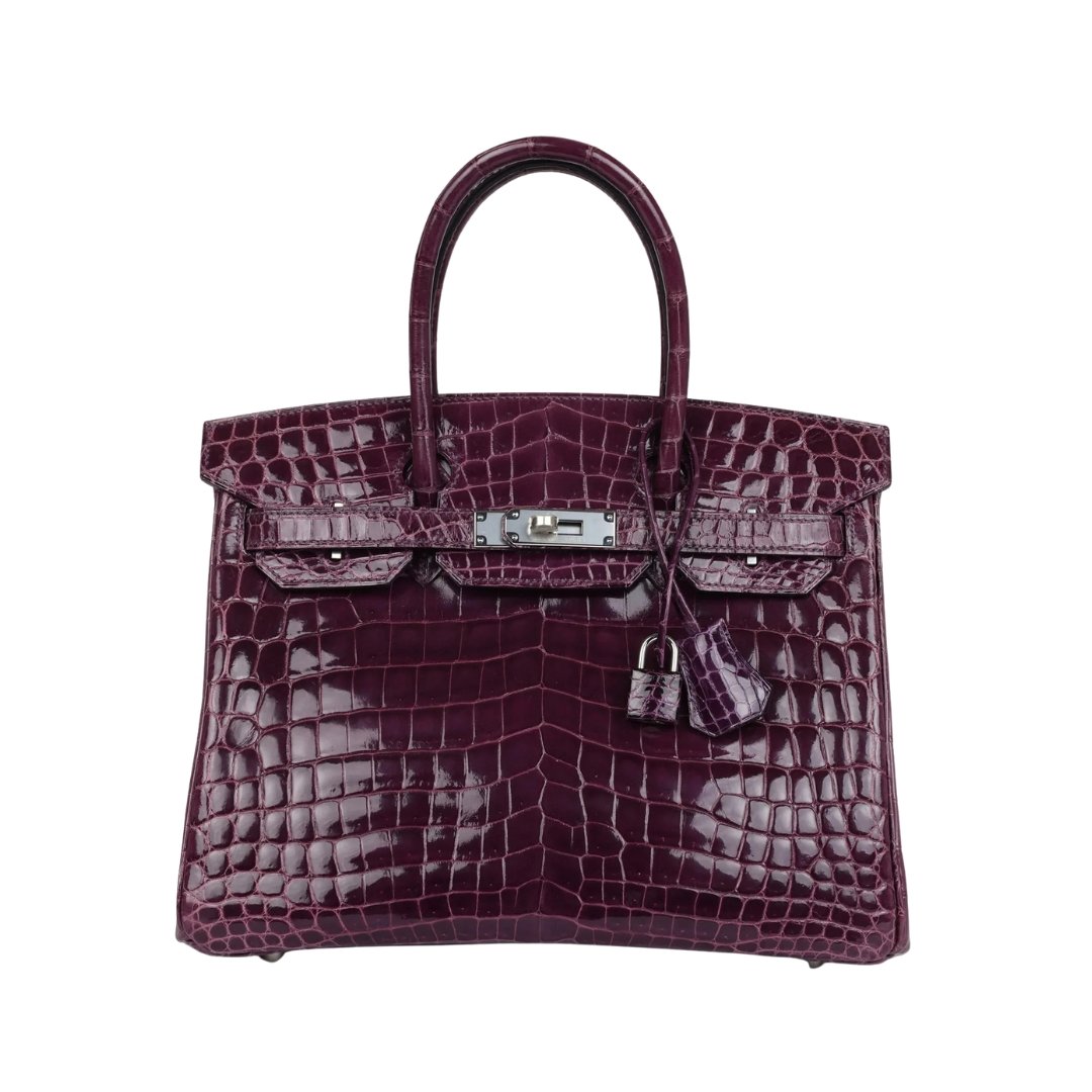 Borsa Hermès Birkin 30 in coccodrillo Niloticus lucido color ametista con hardware in palladio