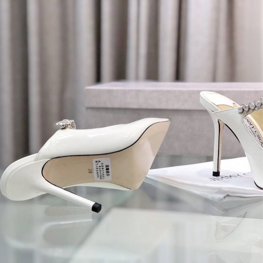 Mules Jimmy Choo Bing in raso bianco con cinturino gioiello 10 cm