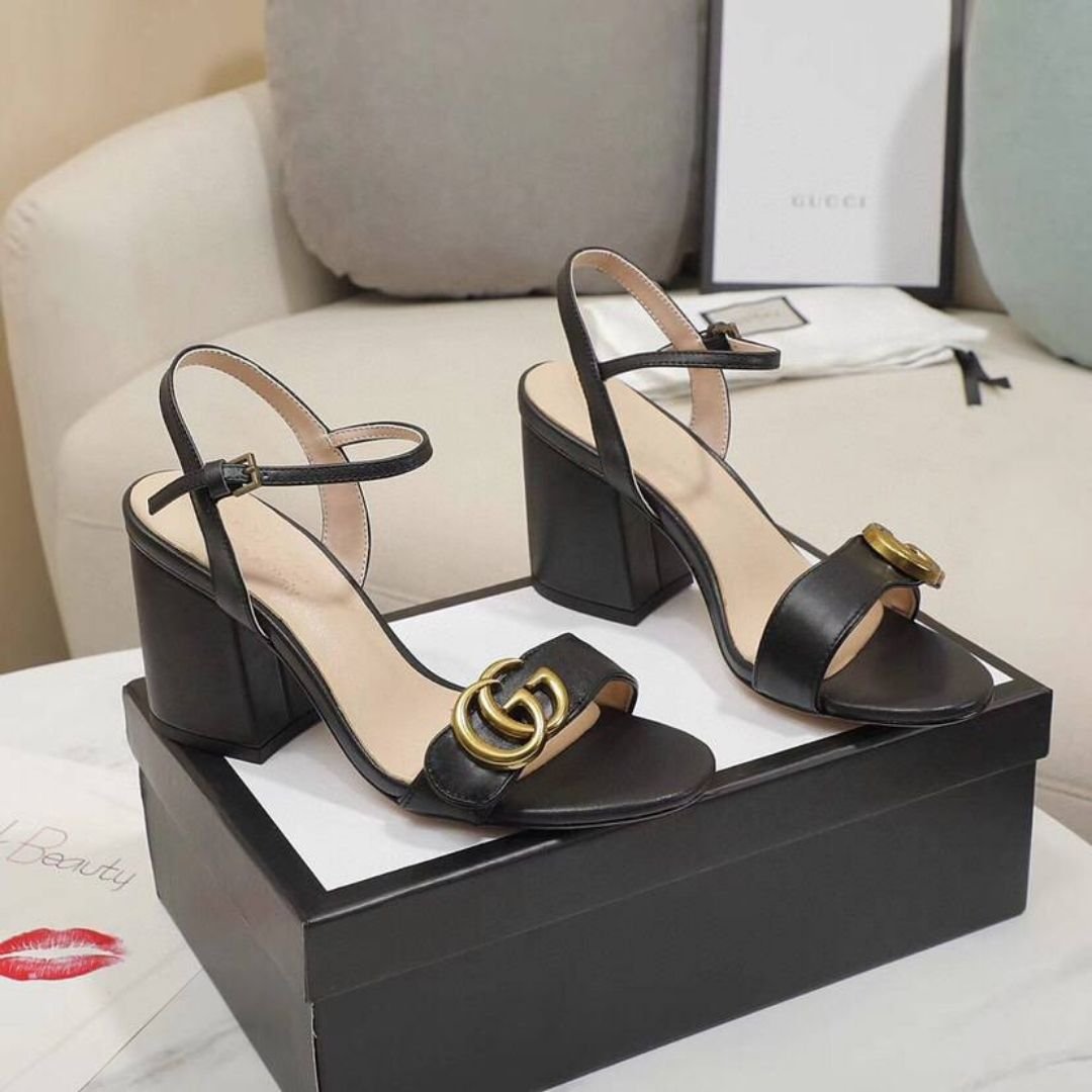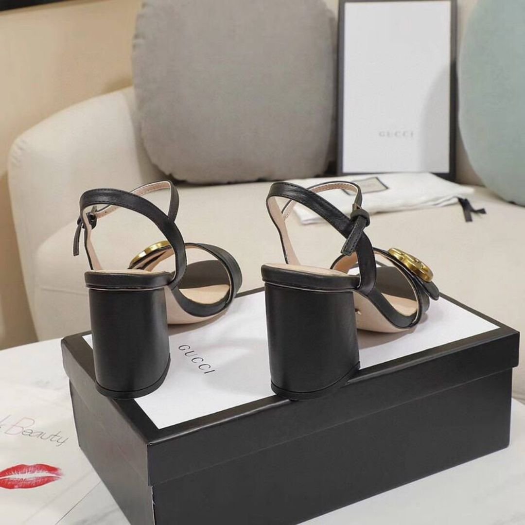 Sandali Gucci in pelle nera con tacco 7,6 cm e logo GG