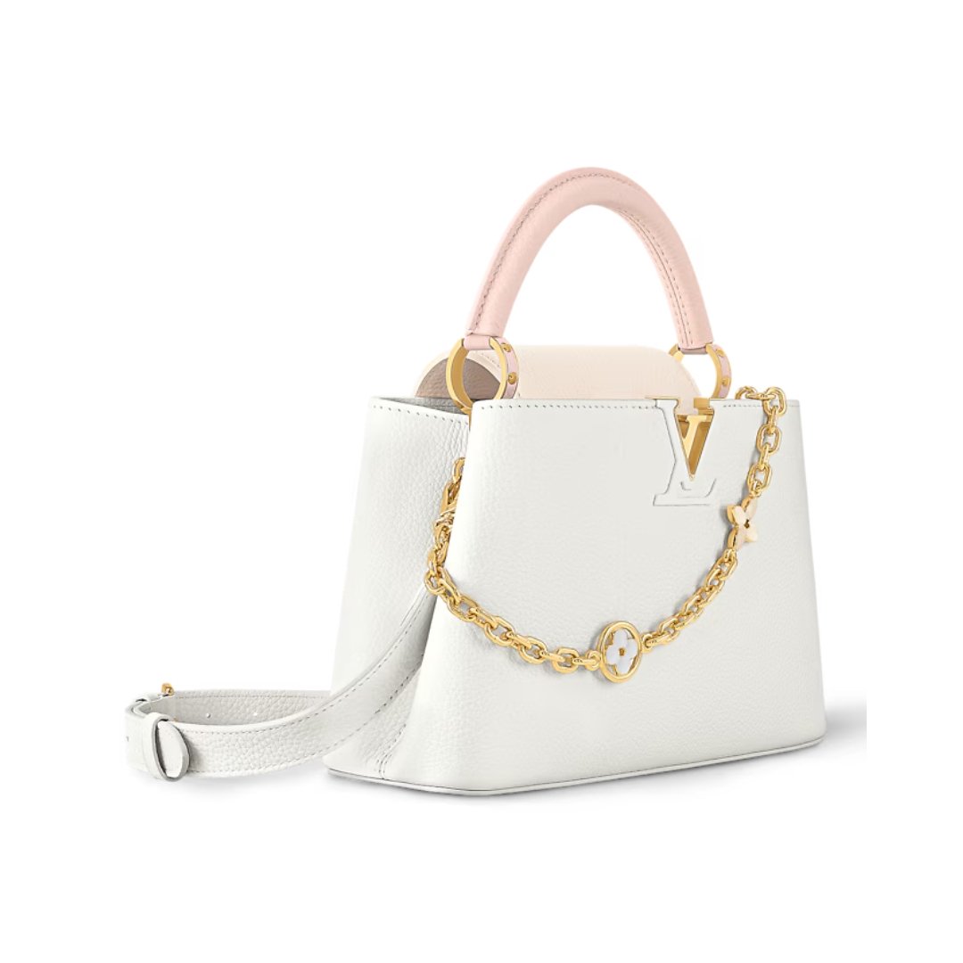 Borsa Louis Vuitton Capucines BB bianca con manico rosa e catena Charms 27 cm