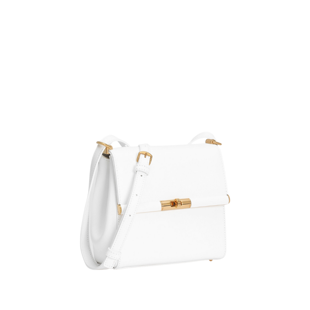 Dimensioni:● Larghezza: 20 cm● Altezza: 15 cm● Profondità: 8 cm Dettagli:● Materiale: Pelle liscia di vitello● Colore: Bianco● Chiusura: Patta