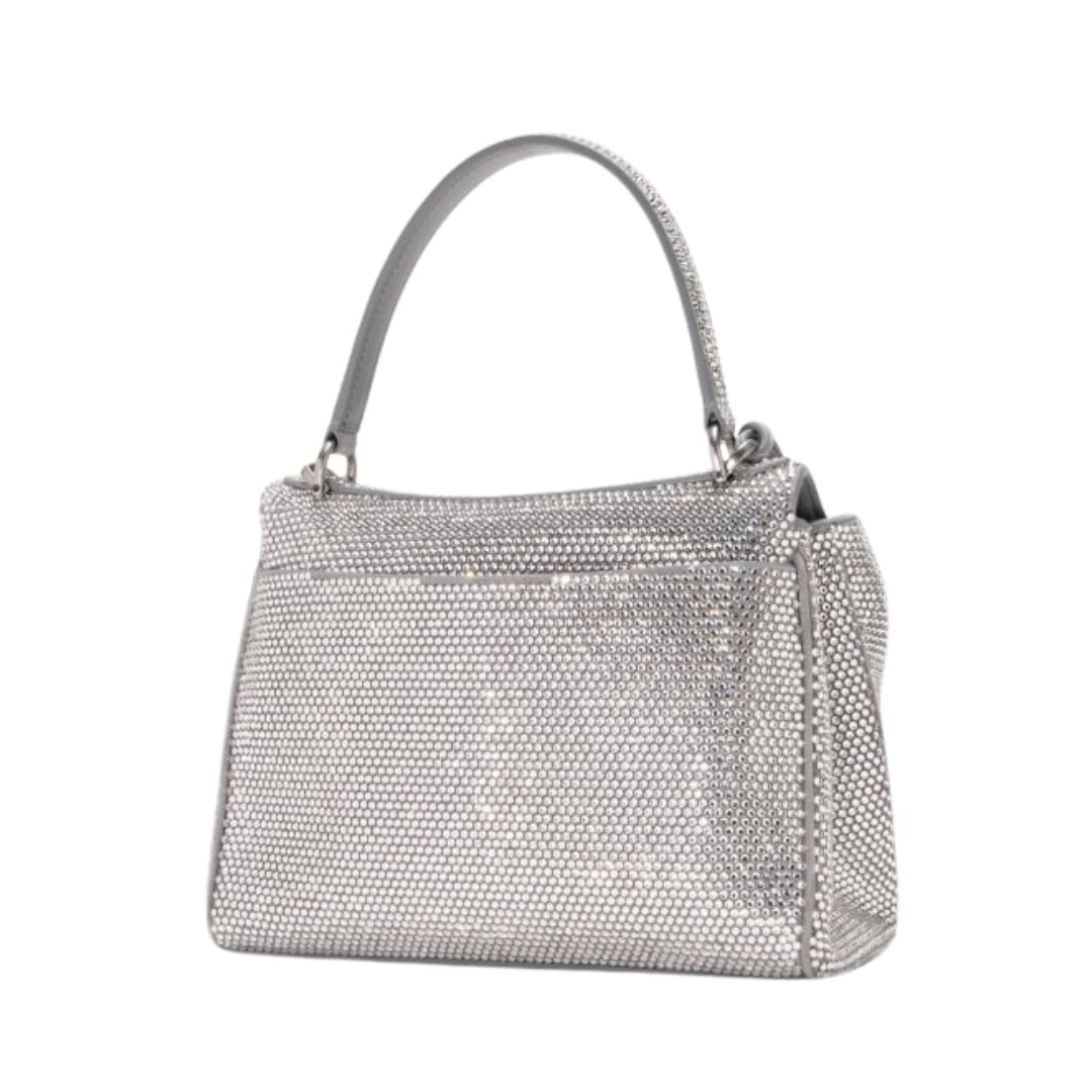 Dimensioni:● Larghezza: 26 cm● Altezza: 16 cm● Profondità: 8 cm Dettagli:● Materiale: Pelle metallizzata● Colore: Argento● Chiusura: Zip superiore● Logo: