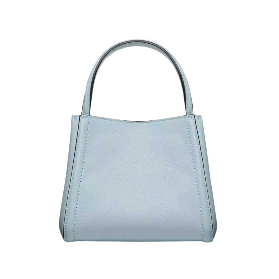 Dimensioni:● Larghezza: 19 cm● Altezza: 17 cm● Profondità: 8 cm Dettagli:● Materiale: Pelle martellata● Colore: Azzurro porcellana● Chiusura: Patta con