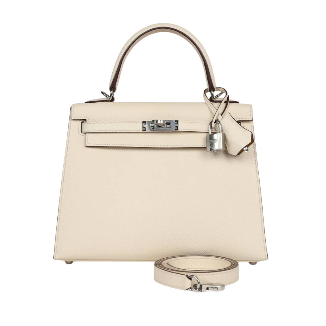Borsa Hermès Kelly 25 in pelle Epsom crema con finiture argentate