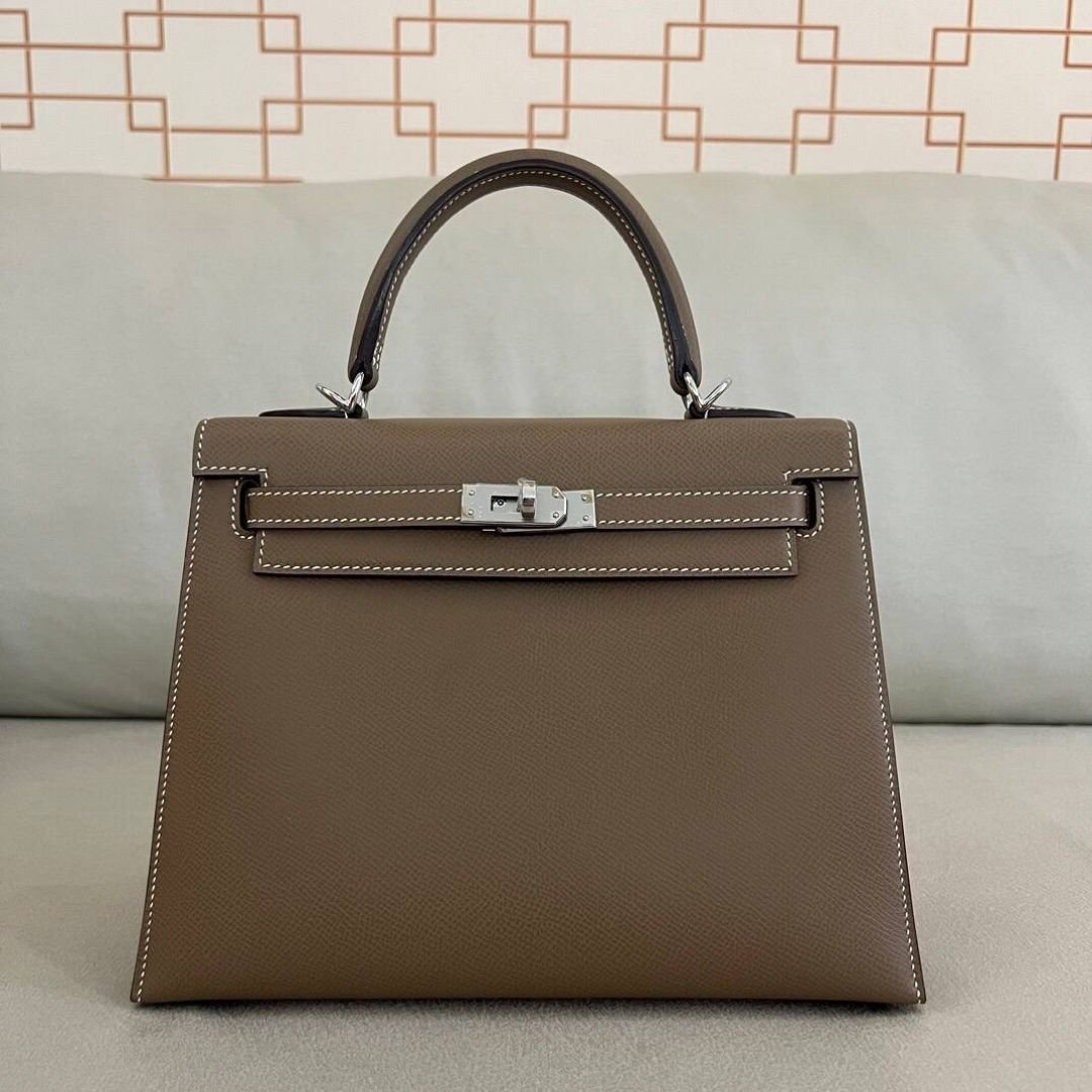 Dettagli:● Dimensioni: 25 x 19 x 9 cm● Materiale: pelle Epsom rigida● Colore: Etoupe (talpa)● Chiusura: patta con fibbia Kelly●