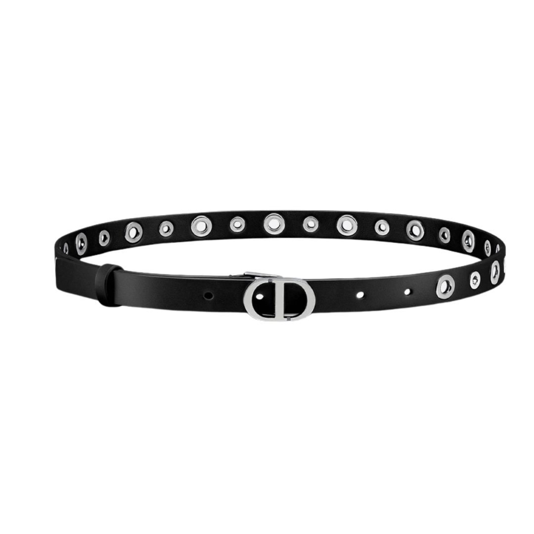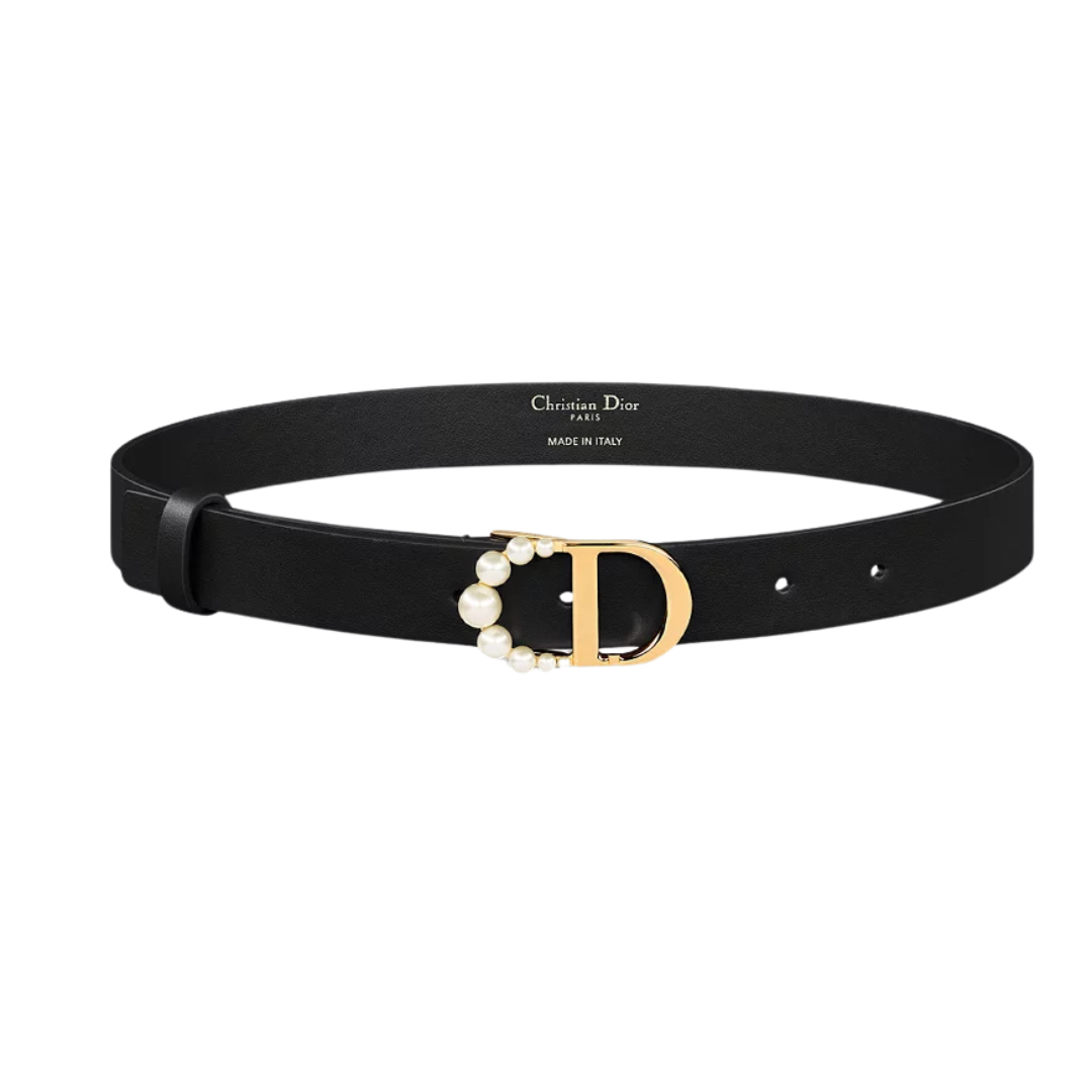 Cintura Dior 30 Montaigne in vitello nero con perle bianche 2 cm