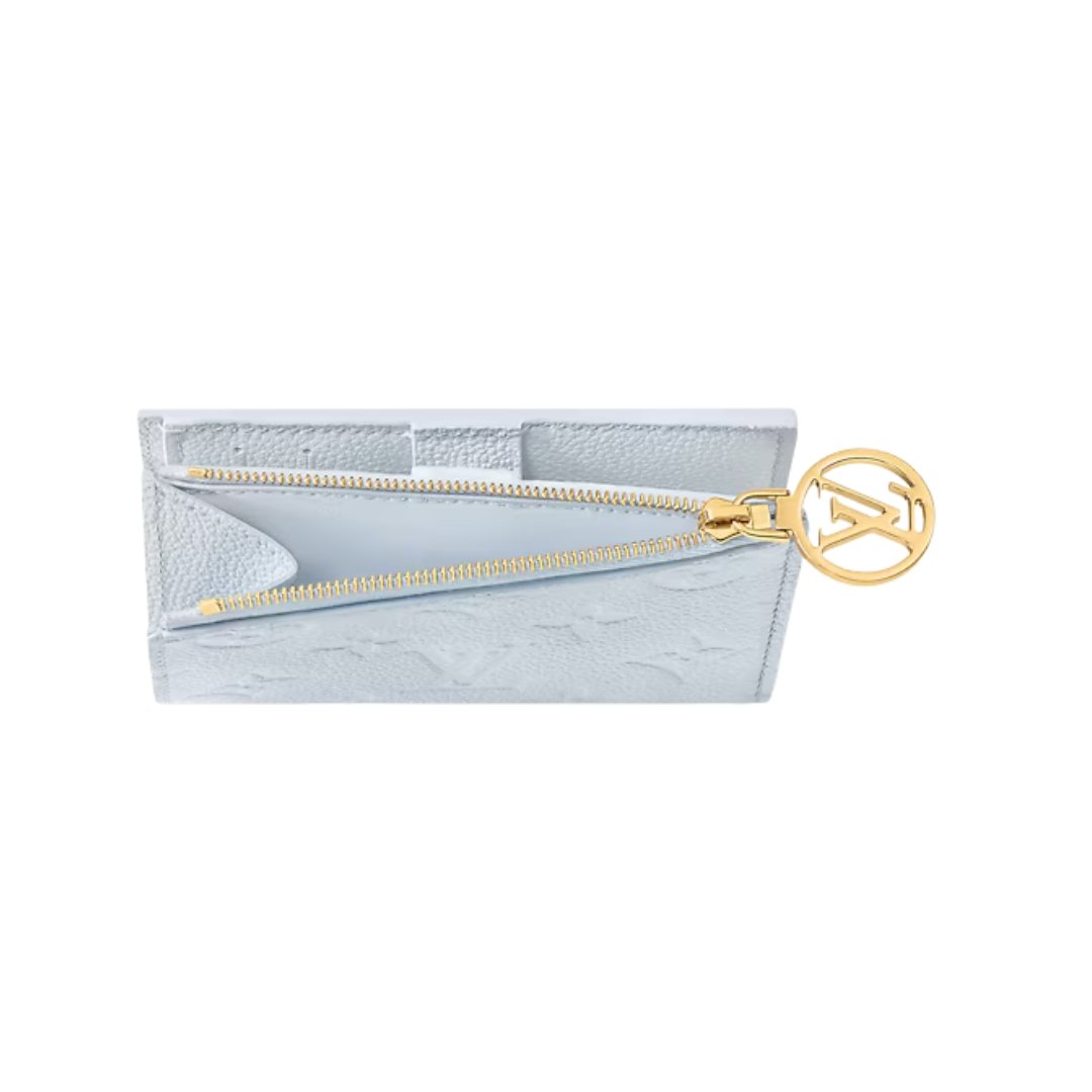 Dimensioni:● Larghezza: 19 cm● Altezza: 10 cm● Profondità: 2 cm Dettagli:● Materiale: pelle liscia● Colore: azzurro cielo● Chiusura: zip a