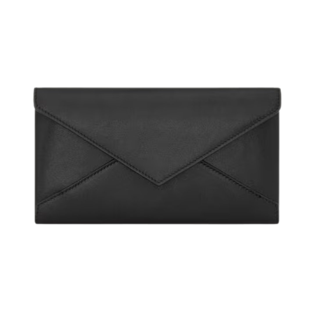 Dimensioni:● Larghezza: 19 cm● Altezza: 10 cm● Profondità: 2.5 cm Dettagli:● Materiale: pelle liscia● Colore: nero● Chiusura: bottone magnetico● Logo: