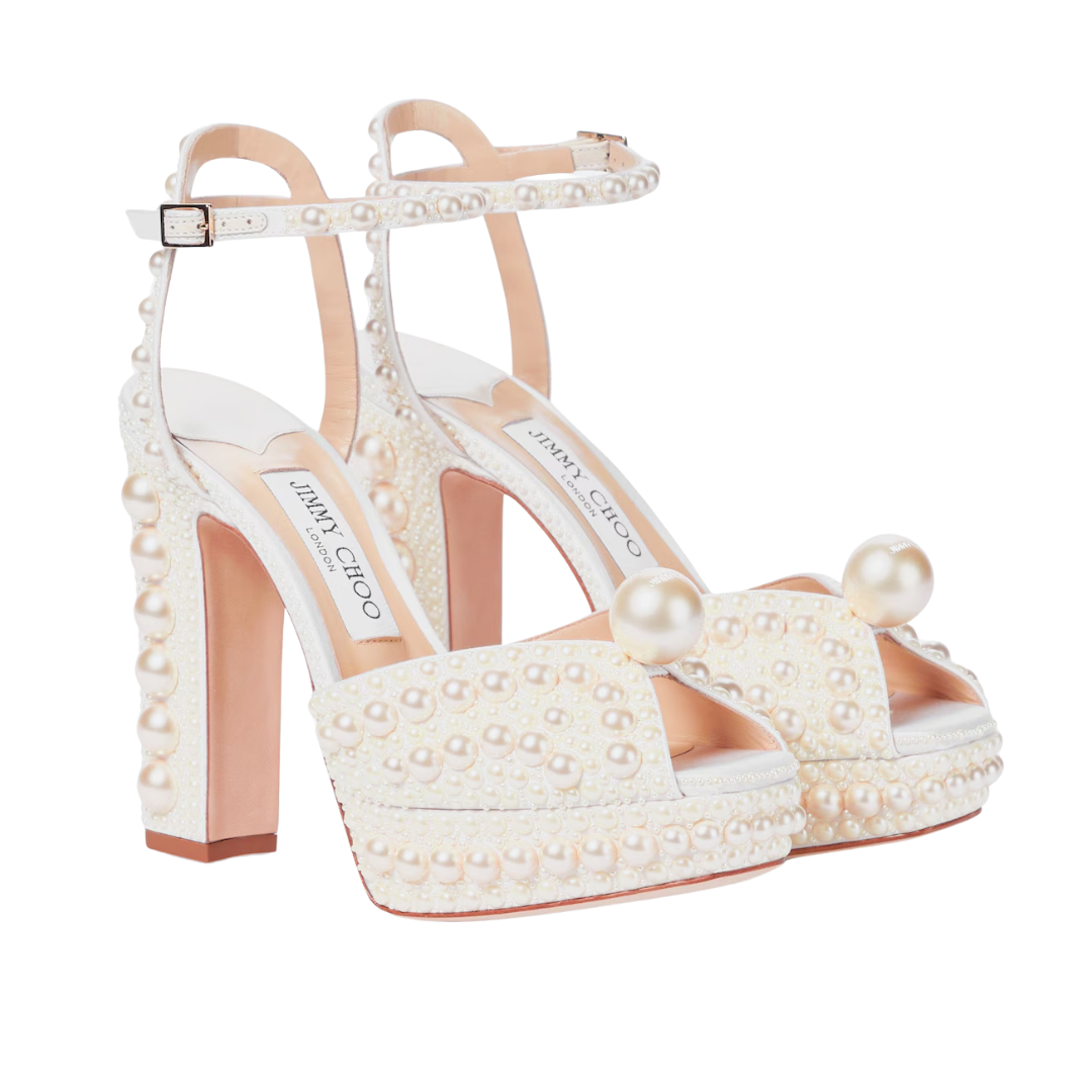 Sandali Jimmy Choo Sacaria in raso avorio con perle 12 cm