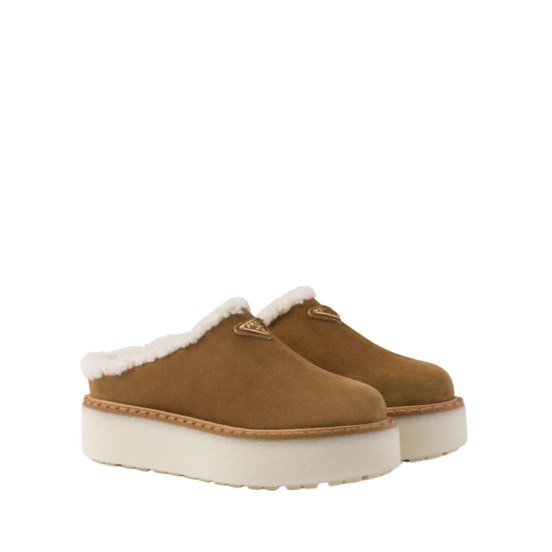 Dettagli:● Materiale: Camoscio e shearling● Colore: Marrone● Chiusura: Senza chiusura● Logo: Triangolo Prada impresso lateralmente● Suola: In gomma antiscivolo● Interno: