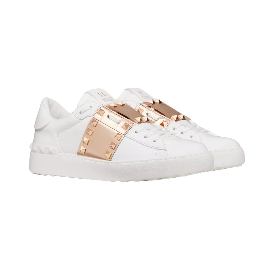 Sneakers Valentino in pelle bianca con fascia rame e borchie