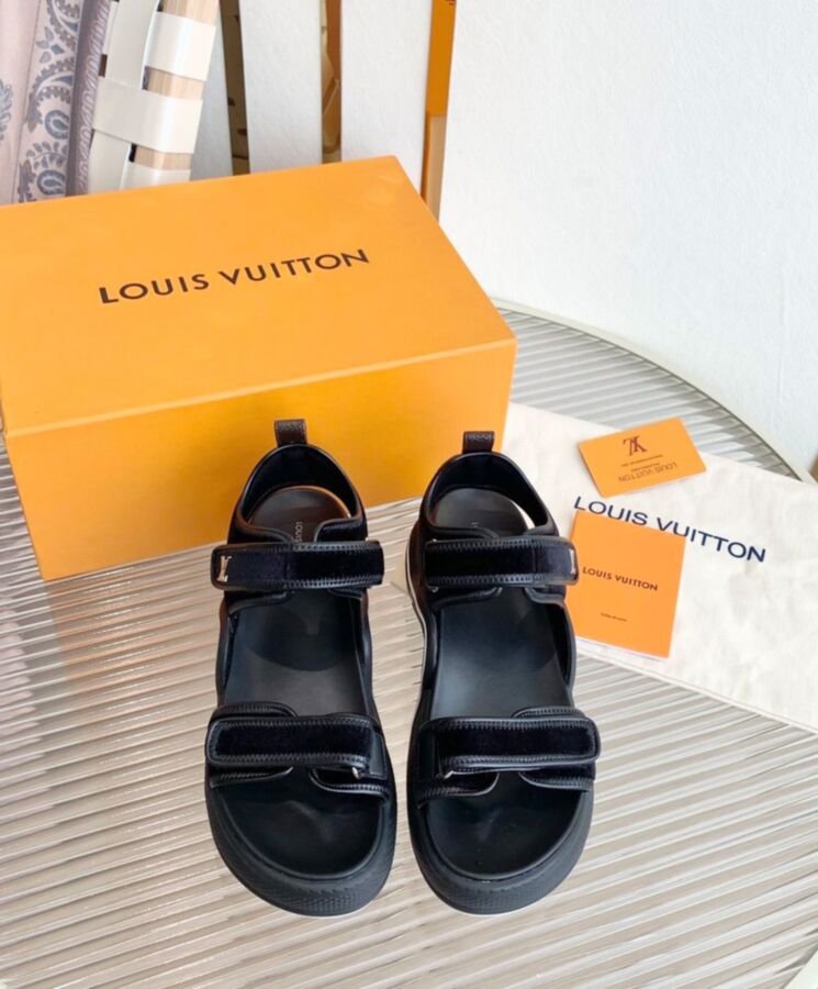 Dettagli:● Materiale: Tessuto tecnico e pelle● Colore: Nero/bianco● Chiusura: Strap in velcro regolabili● Logo: LV Circle in rilievo● Suola: Oversize