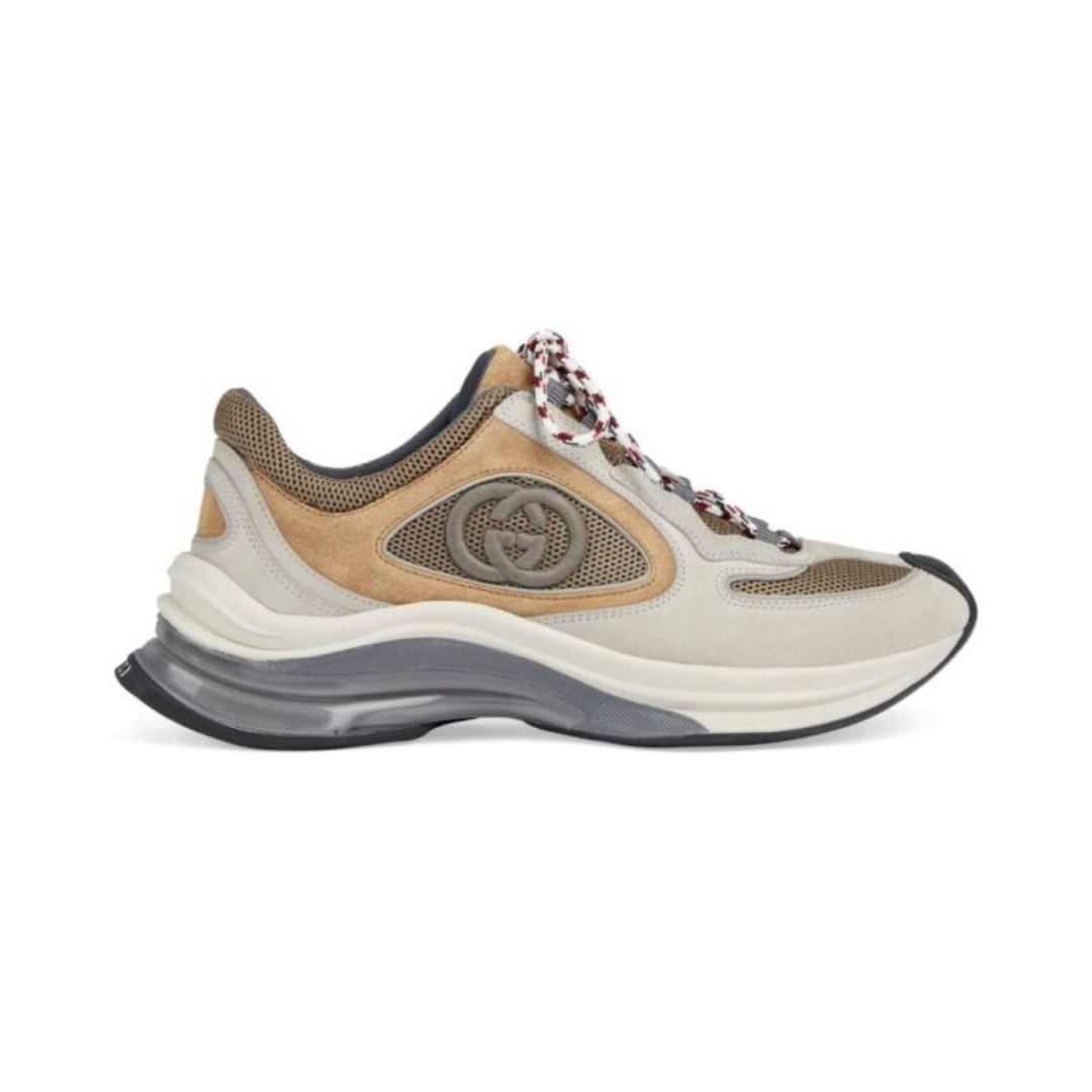 Dettagli:● Materiale: Tessuto tecnico, suede e pelle● Colore: Bianco, marrone e grigio● Chiusura: Lacci bianchi in cotone● Logo: Patch GG