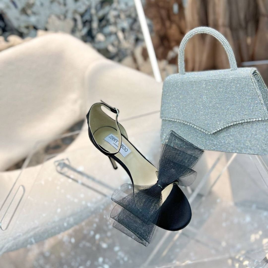 Sandali Jimmy Choo Aveline in raso nero con fiocco 10 cm