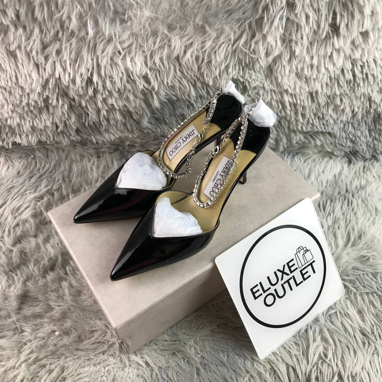 Dettagli:● Materiale: Vernice e cristalli● Colore: Nero● Chiusura: Cavigliera con catenina decorativa● Logo: Sulla soletta interna● Suola: In cuoio● Interno: