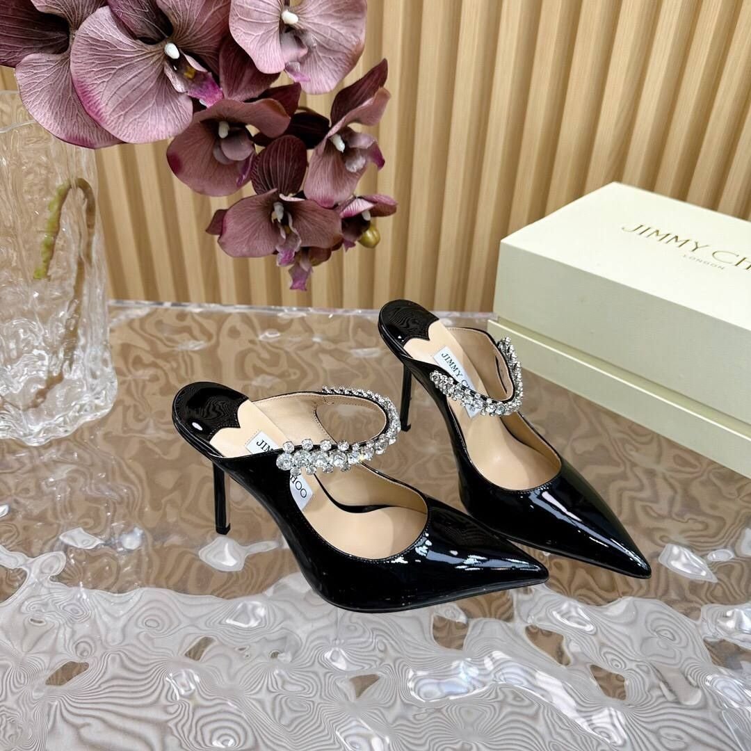 Mules Jimmy Choo Bing in vernice nera con cinturino gioiello 6 cm