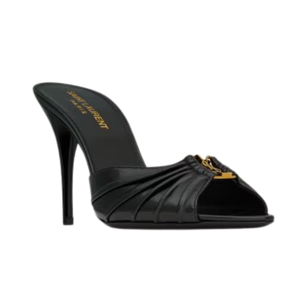 Dettagli:● Materiale: Satin crêpe● Colore: Nero● Chiusura: Senza chiusura● Logo: Tacco scultura YSL dorato● Suola: Cuoio● Interno: Pelle● Parti metalliche: