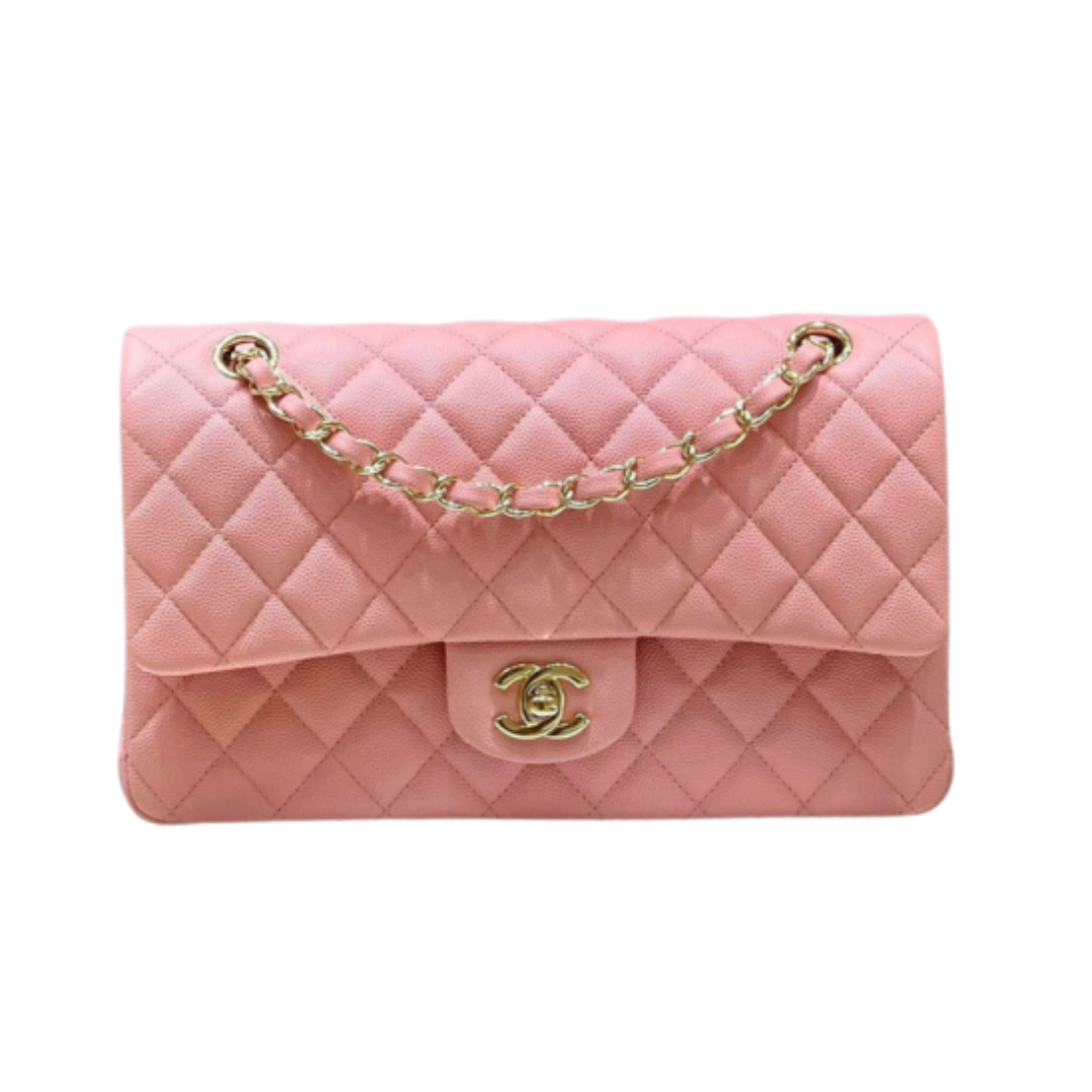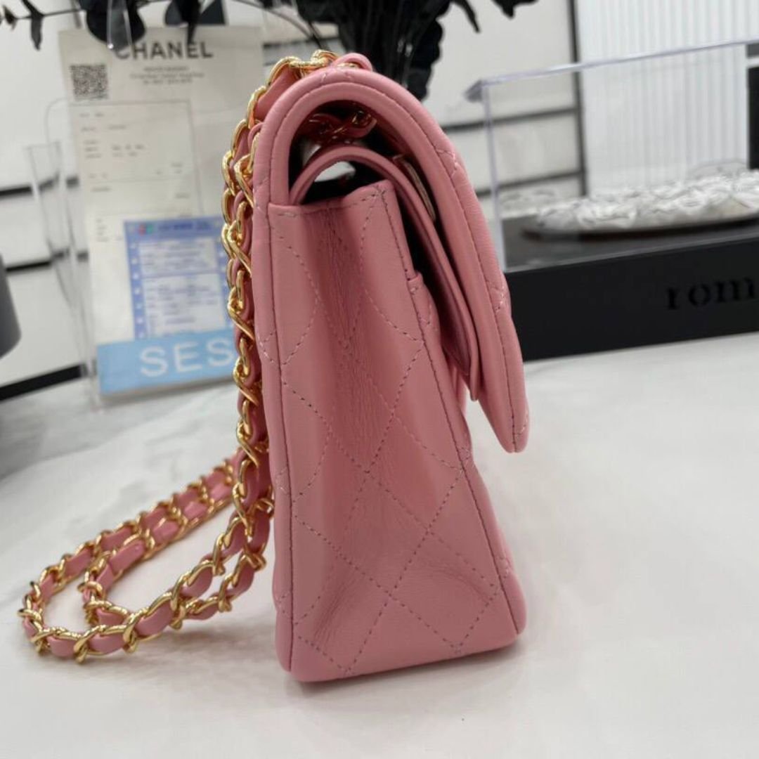 Borsa Chanel Classic Flap rosa in pelle martellata 25,5 cm