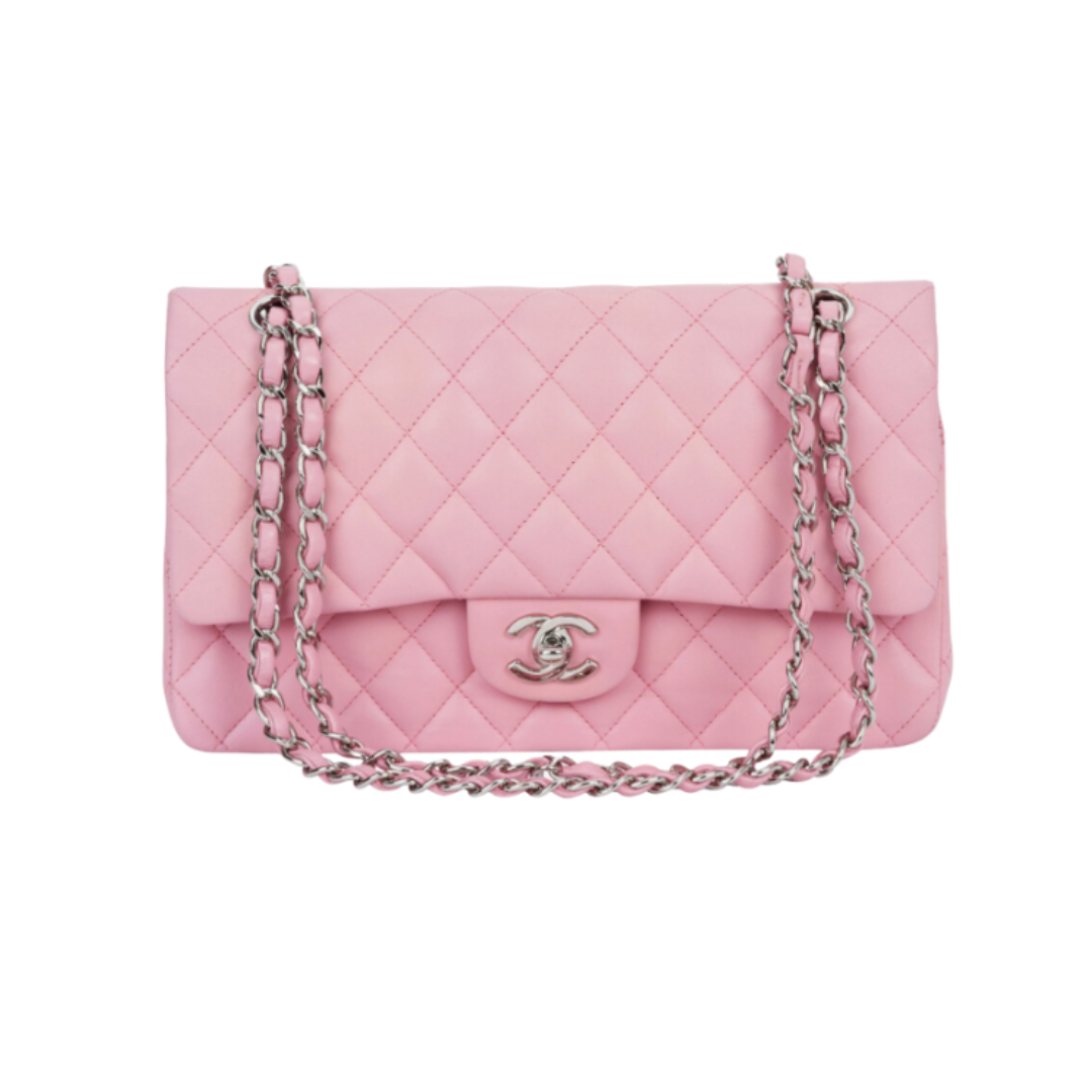 Borsa Chanel Classic Flap rosa con finiture argento 30 cm