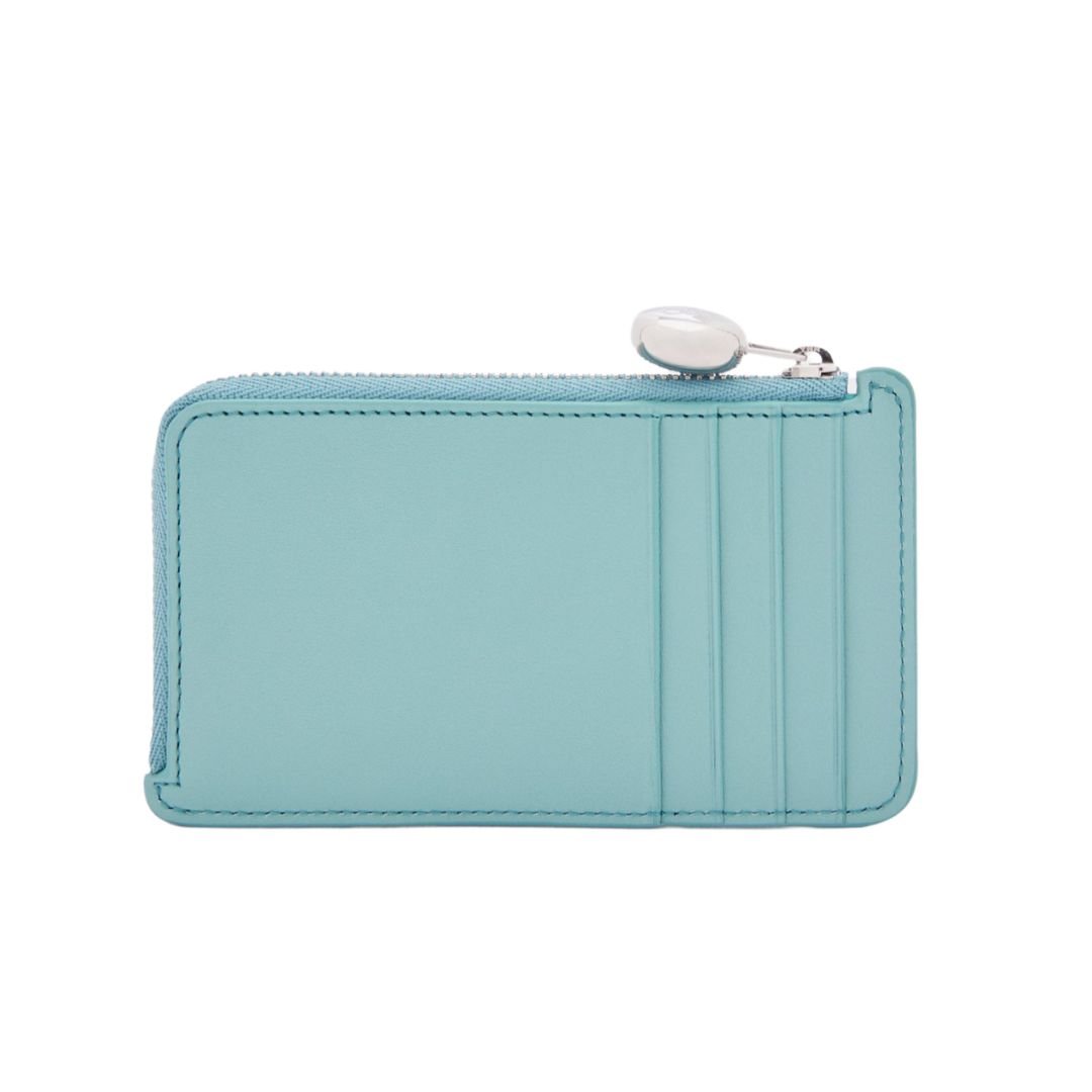 Dimensioni:● Larghezza: 13 cm● Altezza: 7.5 cm● Profondità: 0.5 cm Dettagli:● Materiale: Nappa lucida di vitello● Colore: Azzurro chiaro● Chiusura: