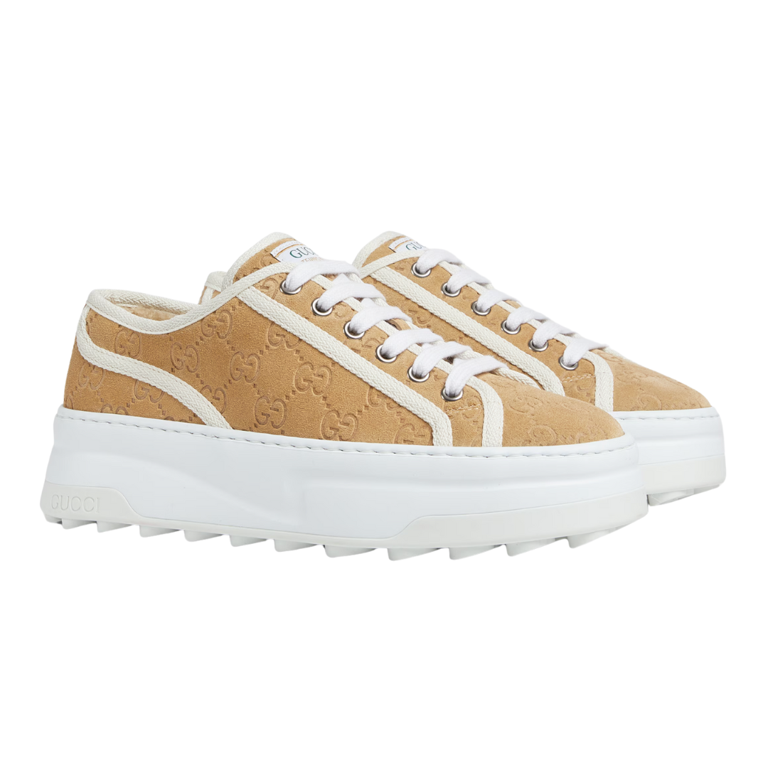 Dettagli:● Materiale: Suede con stampa GG● Colore: Beige● Chiusura: Lacci bianchi in cotone● Logo: Logo GG all-over e GUCCI sul