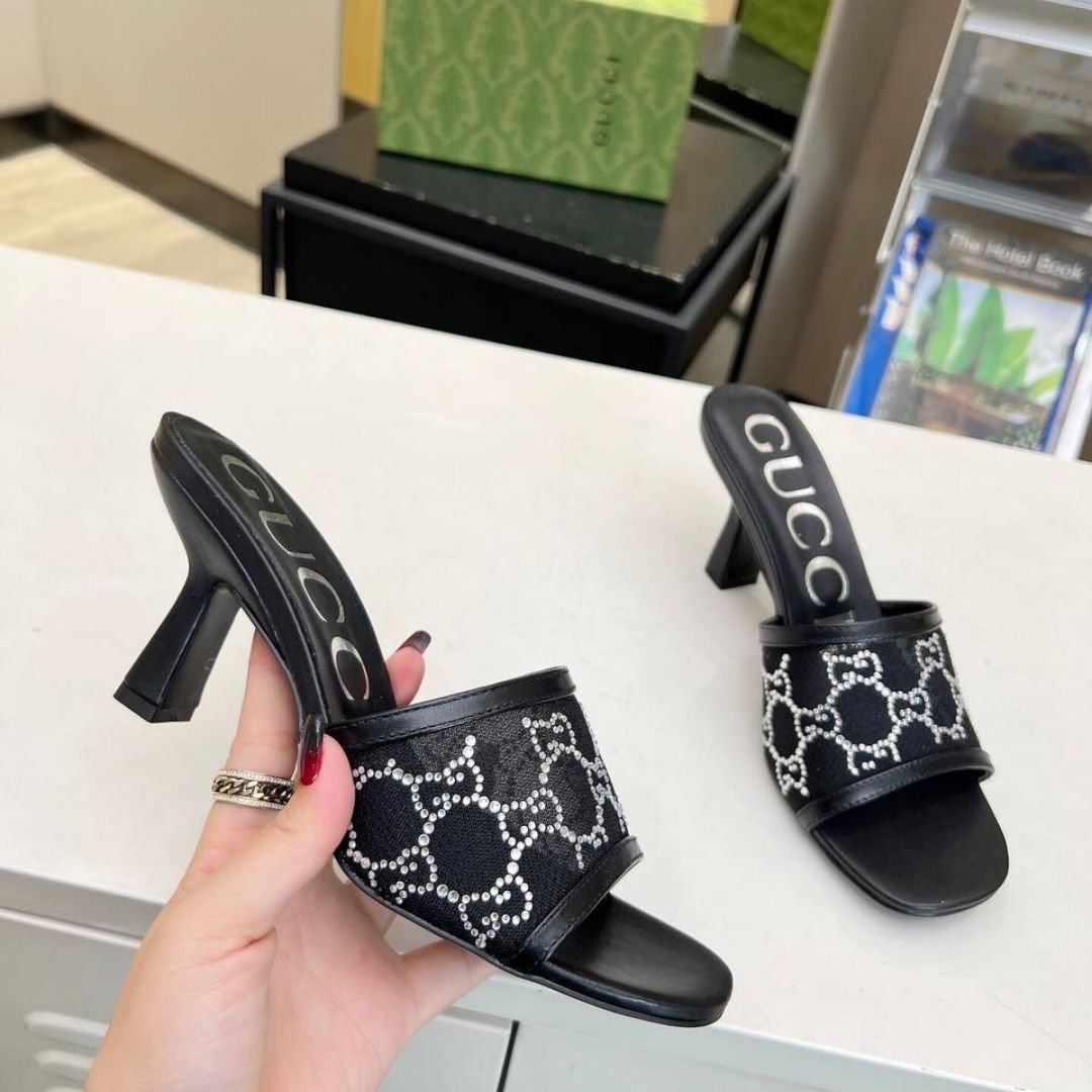Mules Gucci neri in mesh con logo GG in cristalli e tacco 7,5 cm